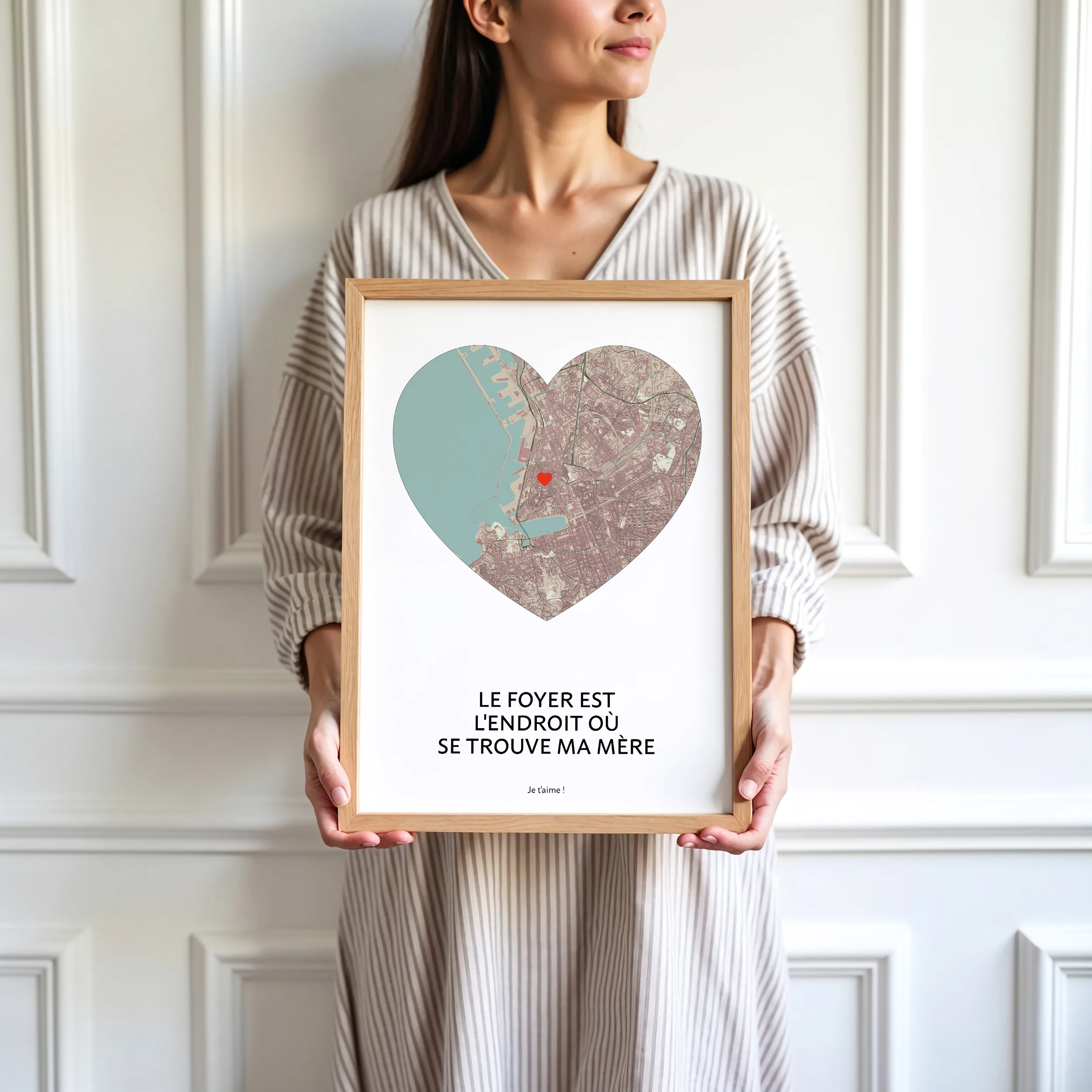 Cette magnifique illustration de carte affiche un lieu de votre choix avec tous les détails que vous trouverez sur une carte. Posez une épingle à l'endroit où vous vous sentez chez vous pour montrer à votre maman que vous êtes toujours près de son cœur. Nos cartes constituent le cadeau idéal pour la fête des mères et peuvent être entièrement personnalisées pour qu'elle se sente spéciale.