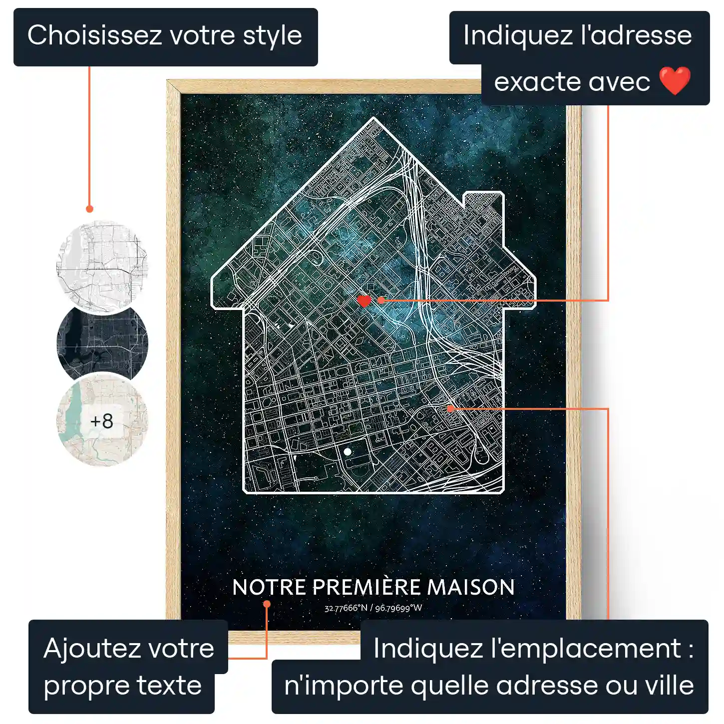 Emménager dans sa première habitation est une expérience unique en son genre. Qu'il s'agisse de son aspect ou de son emplacement, tout ce qui concerne votre nouveau logement vous est propre. C'est pourquoi ce ravissant cadeau est lui aussi tout aussi unique pour votre nouvelle demeure. Chaque élément peut être personnalisé, que ce soit le format de la carte, ses couleurs, ou encore l'emplacement affiché.