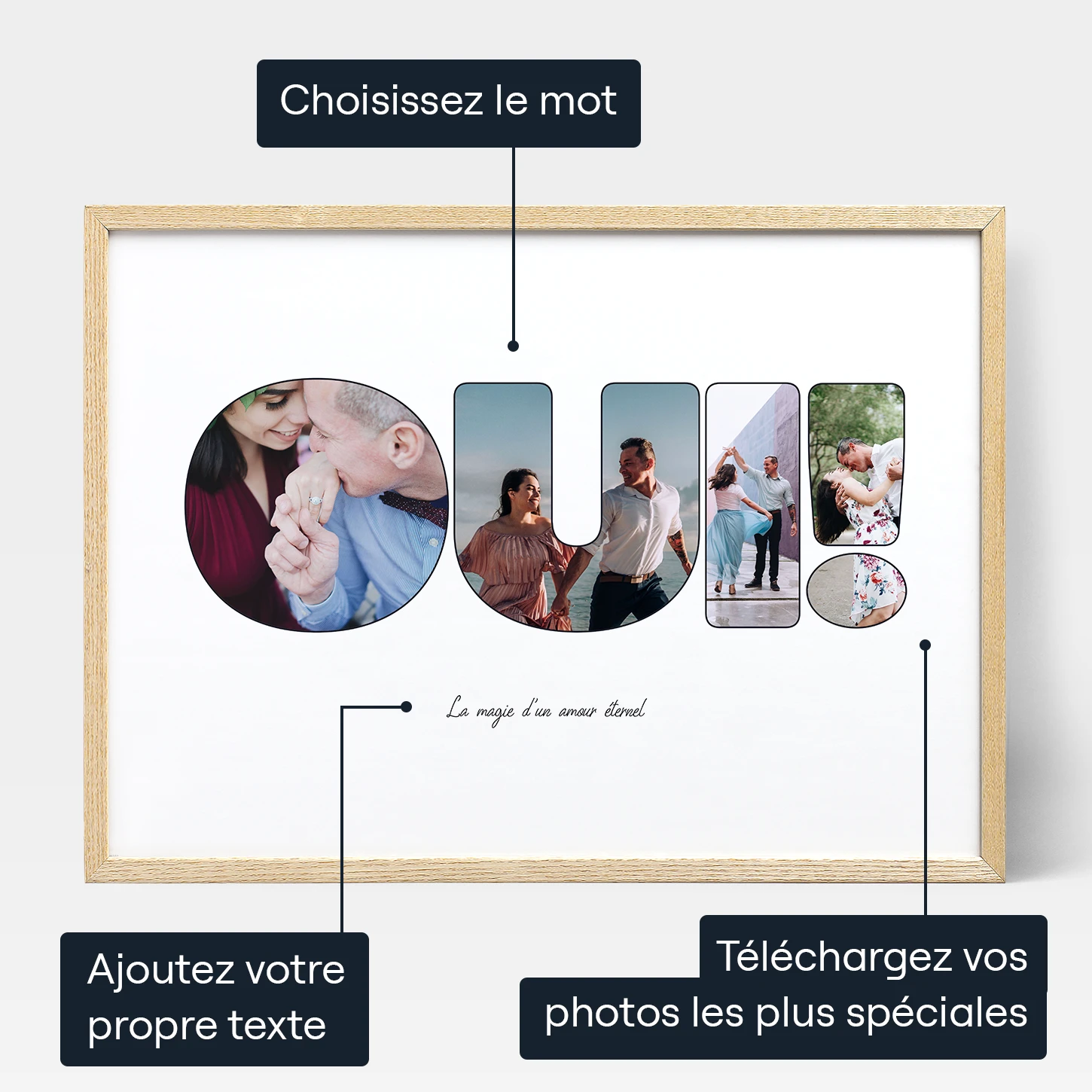 Alors, célébrez vos fiançailles avec un Collage de Photos en Lettre de Fiançailles. C'est un cadeau qui vous représente entièrement, rempli d'amour et de souvenirs inestimables. Il s'agit d'un rappel de votre lien spécial qui vous fera sourire à chaque fois que vous le verrez. Soyez créatif, partagez votre histoire et créez un cadeau qui sera chéri pour toujours.
