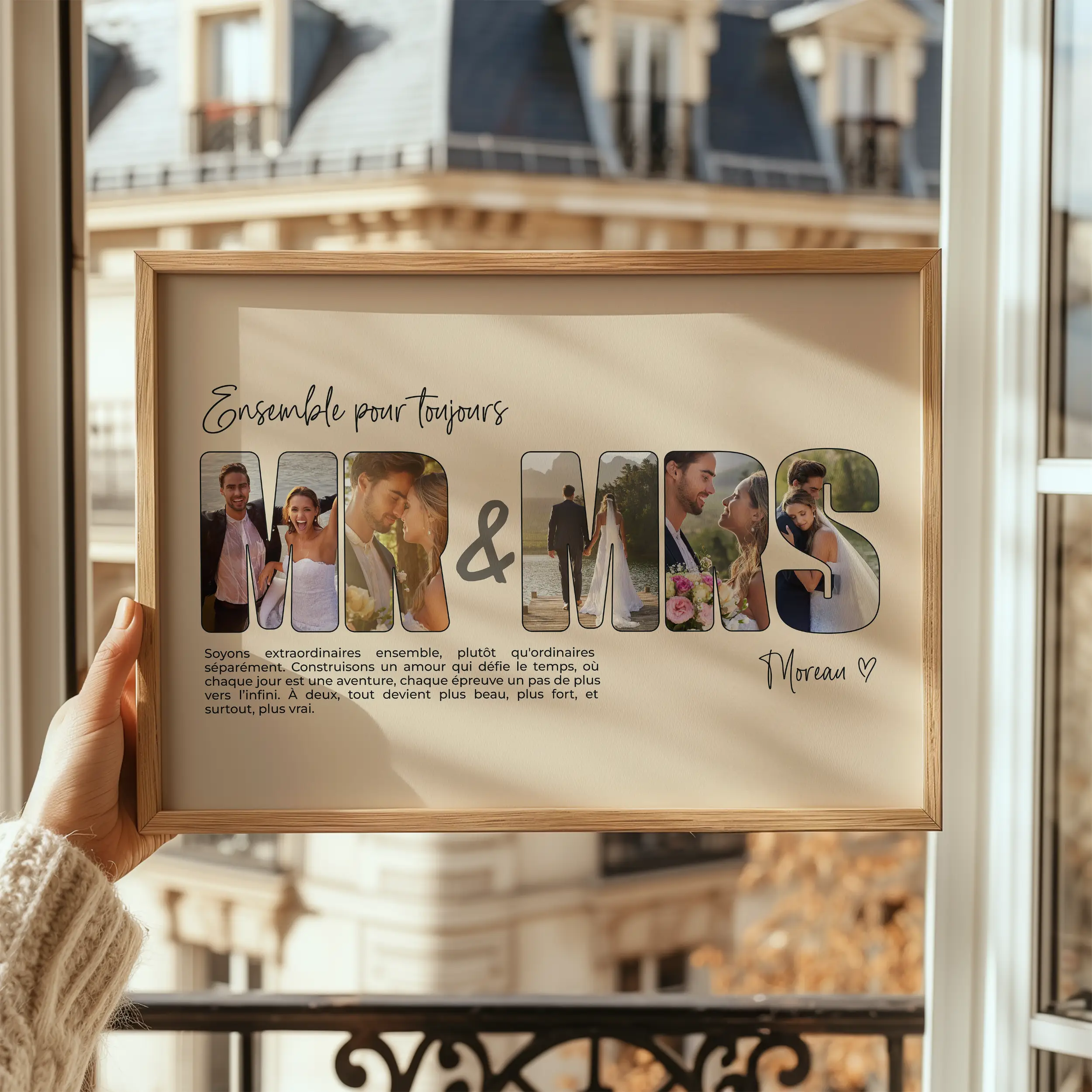 Le collage photo Mr & Mme est un cadeau de mariage unique et rempli d'émotions, parfait pour célébrer l’amour d’un couple d’une manière originale et personnalisée. Grâce à ce design en lettres photos, vous pouvez transformer vos souvenirs préférés en une œuvre d’art sur mesure, où chaque lettre du mot “Mr & Mme”, “Amour”, ou encore une date importante, est illustrée par une photo pleine de sens.