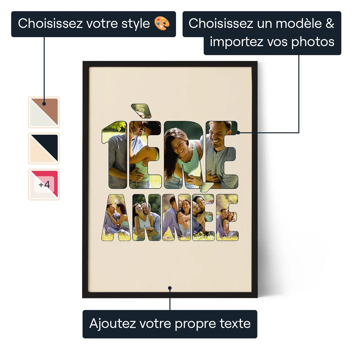 Transformez les photos de votre première année ensemble en un collage personnalisé qui célèbre votre amour, vos souvenirs et le début de votre histoire à deux