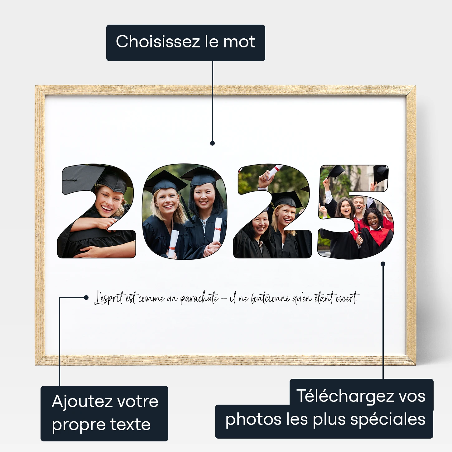 Vous cherchez le cadeau de fin d'études parfait pour célébrer les réalisations du diplômé dans votre vie ? Ne cherchez pas plus loin que le Collage Photo de l'Année du Diplôme de Positive Prints ! Ce cadeau unique et personnalisé vous permet de créer un superbe collage photo sous la forme de l'année d'obtention du diplôme, comme « 2023 » ou toute autre année de votre choix. Vous pouvez également choisir de faire en sorte que les photos forment le mot « diplômé » pour un design plus créatif et unique.