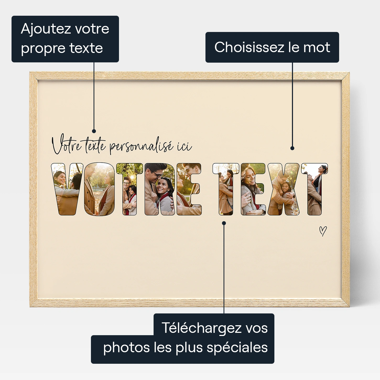 Transformez vos souvenirs préférés en un cadeau unique. Personnalisez n'importe quel mot ou nom avec vos propres photos pour créer un souvenir vraiment significatif