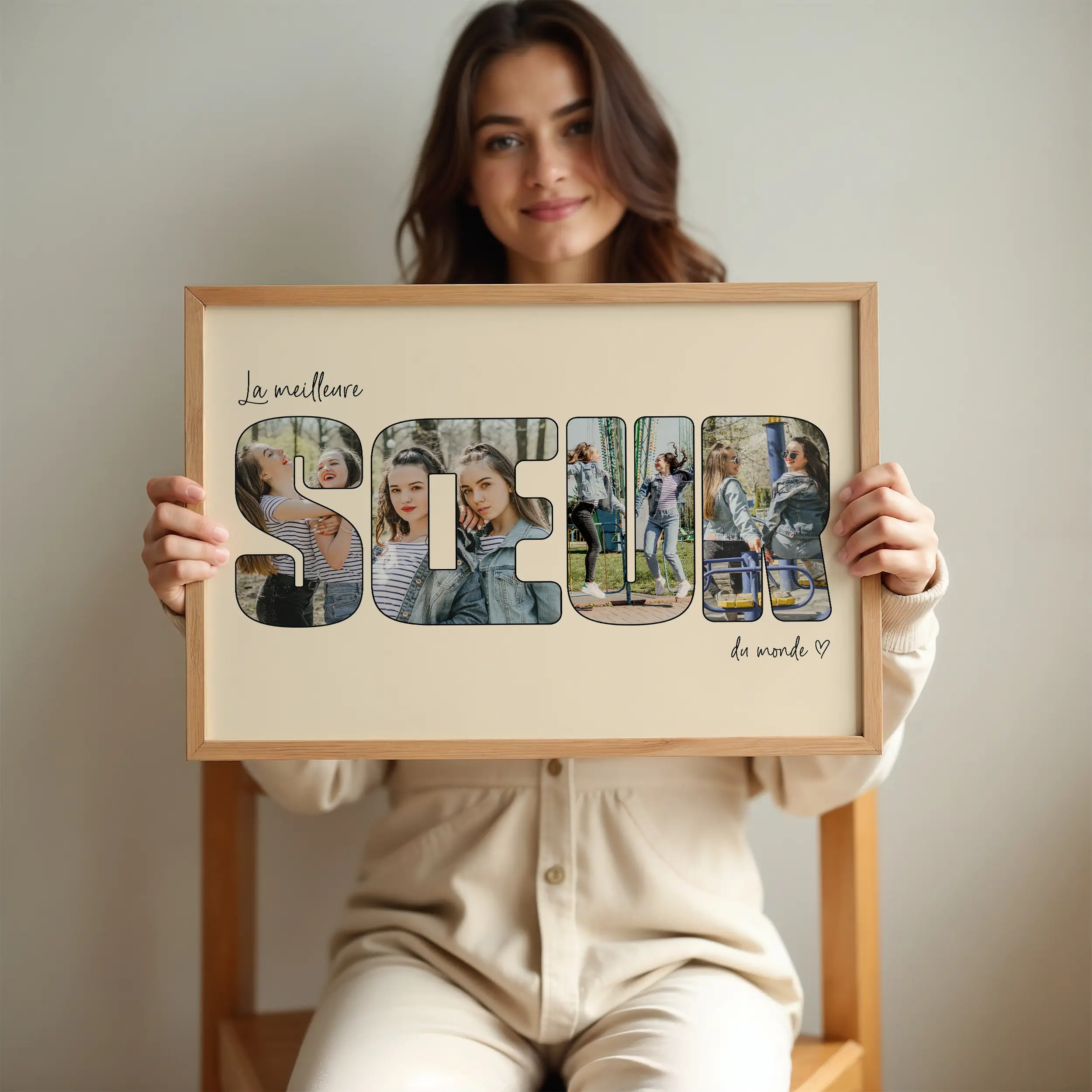 Un Collage Photo en Lettre pour Sœur vous permet de créer un cadeau personnalisé et unique pour votre sœur. Que ce soit pour son anniversaire, Noël, ou tout simplement parce que, un Collage Photo en Lettre pour Sœur offre une belle façon de mettre en valeur des souvenirs chéris. Vous pouvez choisir un mot qui représente le mieux la relation entre vous et votre sœur, ou simplement épeler « Sœur » ou « Sis ». Les possibilités sont infinies et c'est à vous de décider à quel point vous voulez être créatif. Chaque lettre du collage est composée de vos propres photos, ce qui en fait un cadeau vraiment unique en son genre.