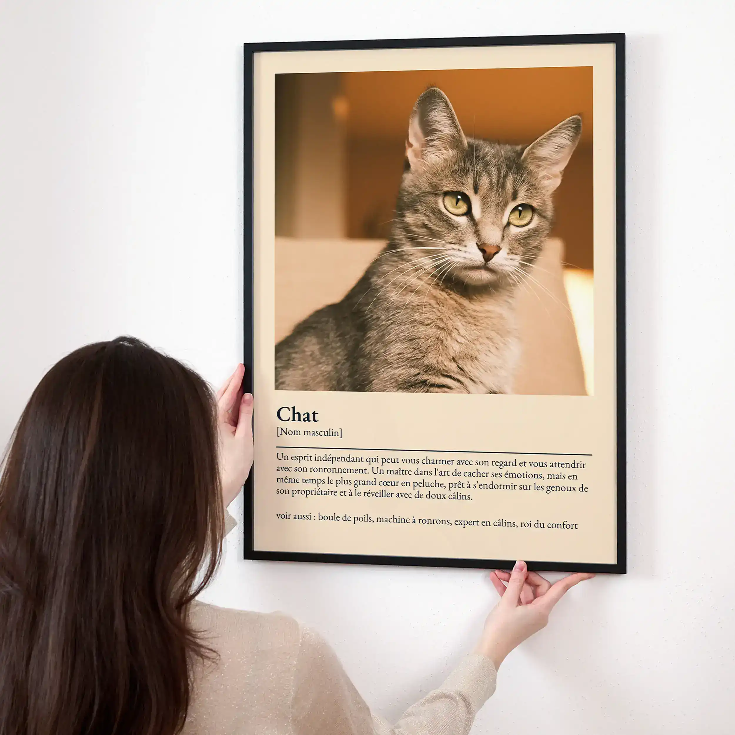 Créez une affiche unique en son genre à partir de la photo de votre chat, accompagnée d’une définition personnalisée qui peut être tendre, amusante ou parfaitement à votre image