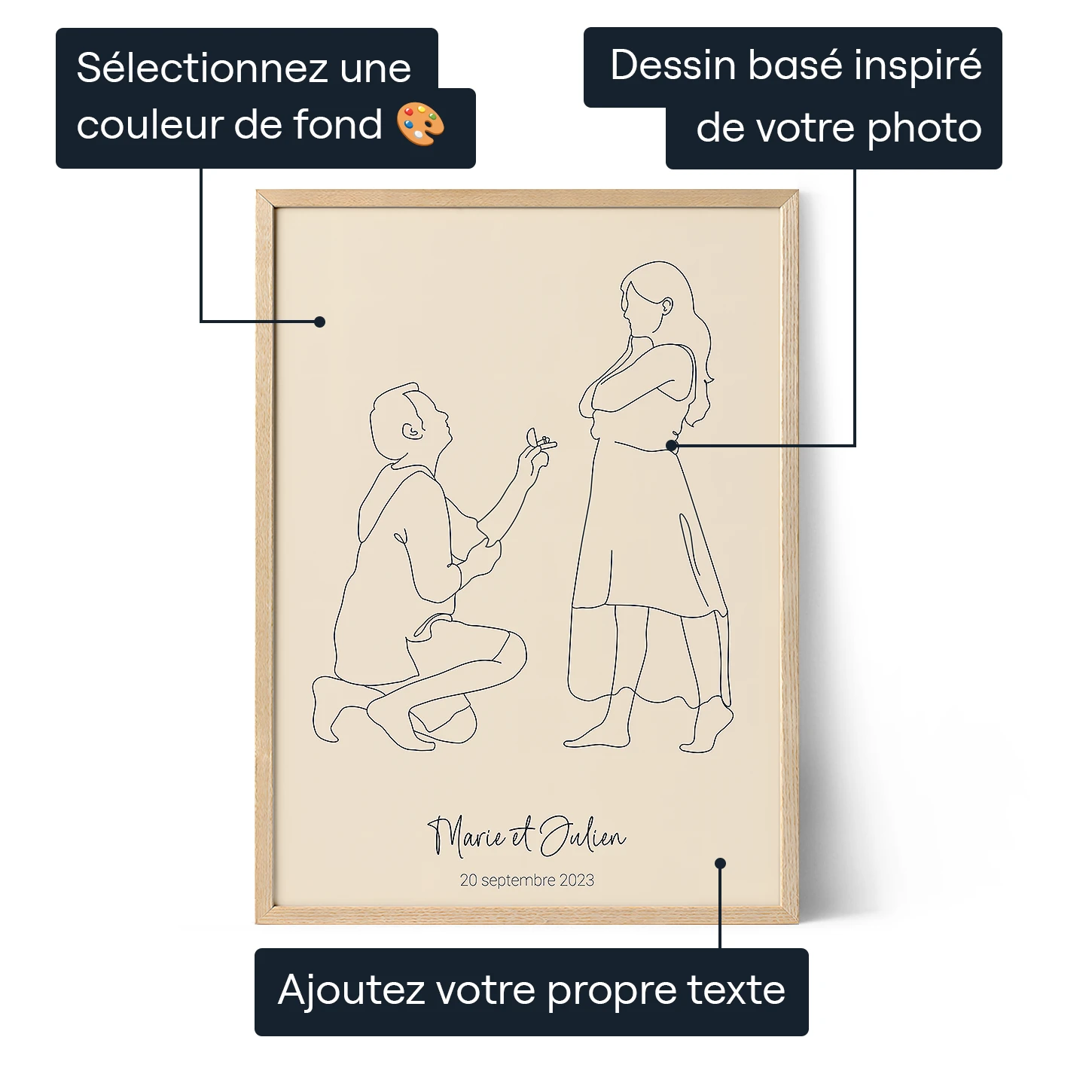 - Laissez nos artistes transformer une photo spéciale de vos fiançailles en une œuvre d'art personnalisée intemporelle.