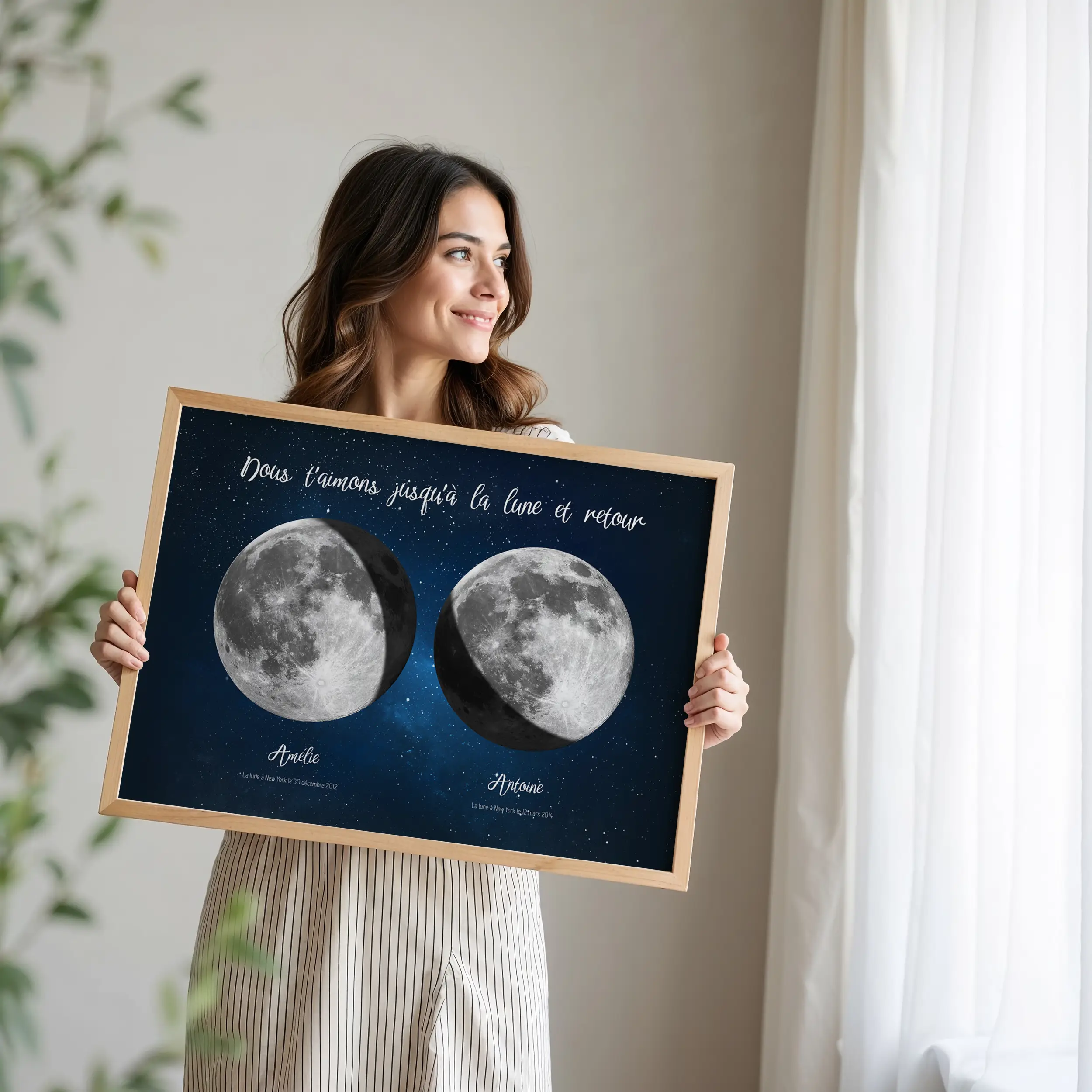Vous cherchez un cadeau spécial pour maman ? Deux Lunes pour Maman est un cadeau unique et sincère qui la fera sourire. Cette impression ou toile personnalisée montre les phases de la lune à partir de deux dates importantes, telles que les dates de naissance de ses enfants. C'est une belle façon de capturer ces moments précieux et de lui rappeler le lien spécial qu'elle partage avec ses enfants.