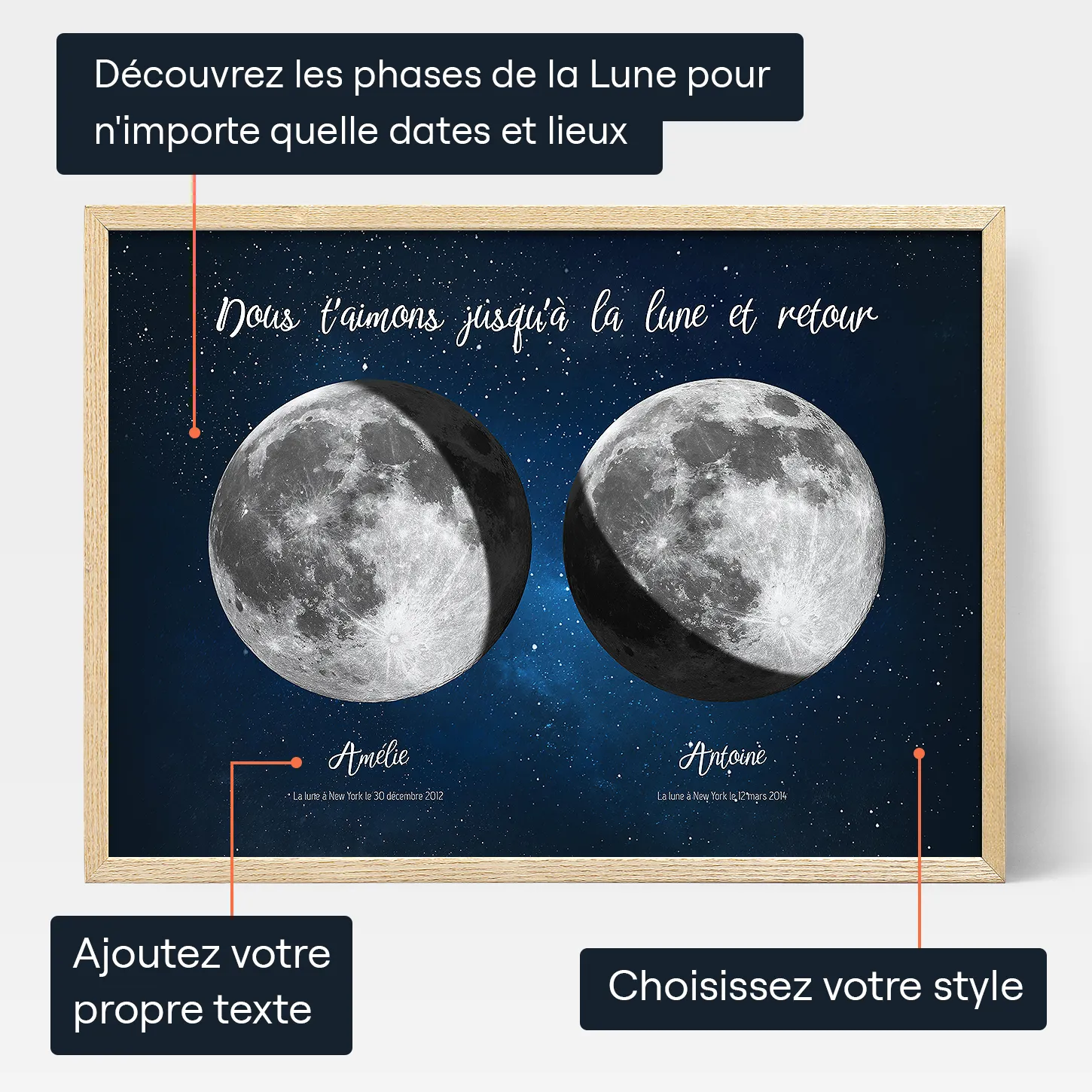 Après avoir défini le titre, entrez l'heure et le lieu pour chaque phase de lune. Cela montrera à quoi ressemblait la lune les jours spéciaux que vous avez choisis, comme les dates de naissance de ses enfants. Sous chaque lune, vous pouvez ajouter des noms ou tout autre texte que vous souhaitez. Enfin, choisissez le format de votre œuvre d'art. Nous offrons plusieurs tailles et styles, y compris des impressions sur affiche imprimées ou encadrées, des toiles et des téléchargements numériques instantanés.