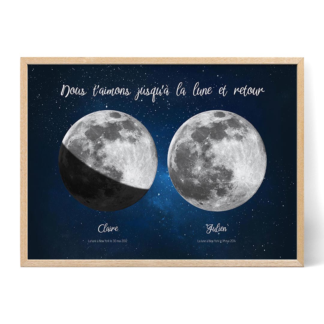 Prêt à créer un cadeau mémorable pour mamie ? Commencez dès maintenant à personnaliser votre œuvre d'art Deux Lunes pour Mamie. Visitez notre éditeur en ligne et commencez par choisir un arrière-plan. Ajoutez un titre sincère, entrez les dates et les lieux pour voir les phases lunaires, et personnalisez le texte sous chaque lune. Sélectionnez le format qui convient le mieux au style de mamie, et vous êtes prêt !