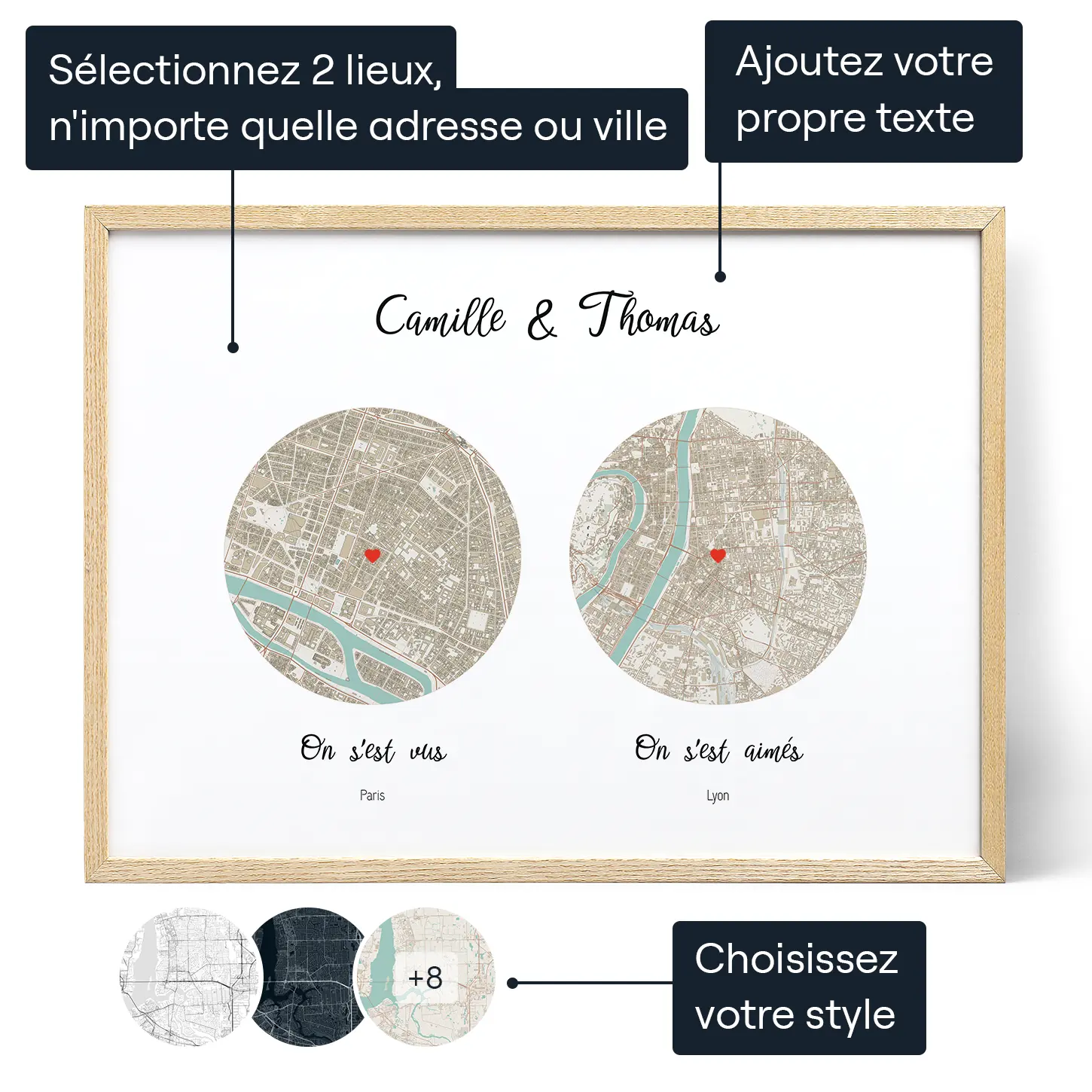 Une Double Carte Où Nous Nous Sommes Rencontrés est une carte personnalisée qui affiche les endroits exacts où deux personnes se sont rencontrées ou ont des souvenirs particuliers ensemble. Elle présente deux cartes côte à côte, chacune avec son propre marqueur indiquant l'emplacement sur la carte. Les cartes sont souvent personnalisées avec des couleurs et des styles uniques pour représenter les goûts et les préférences personnels du couple. Notre impression de carte constitue un cadeau attentionné et significatif, idéal pour les anniversaires de mariage, les mariages ou d'autres occasions spéciales.