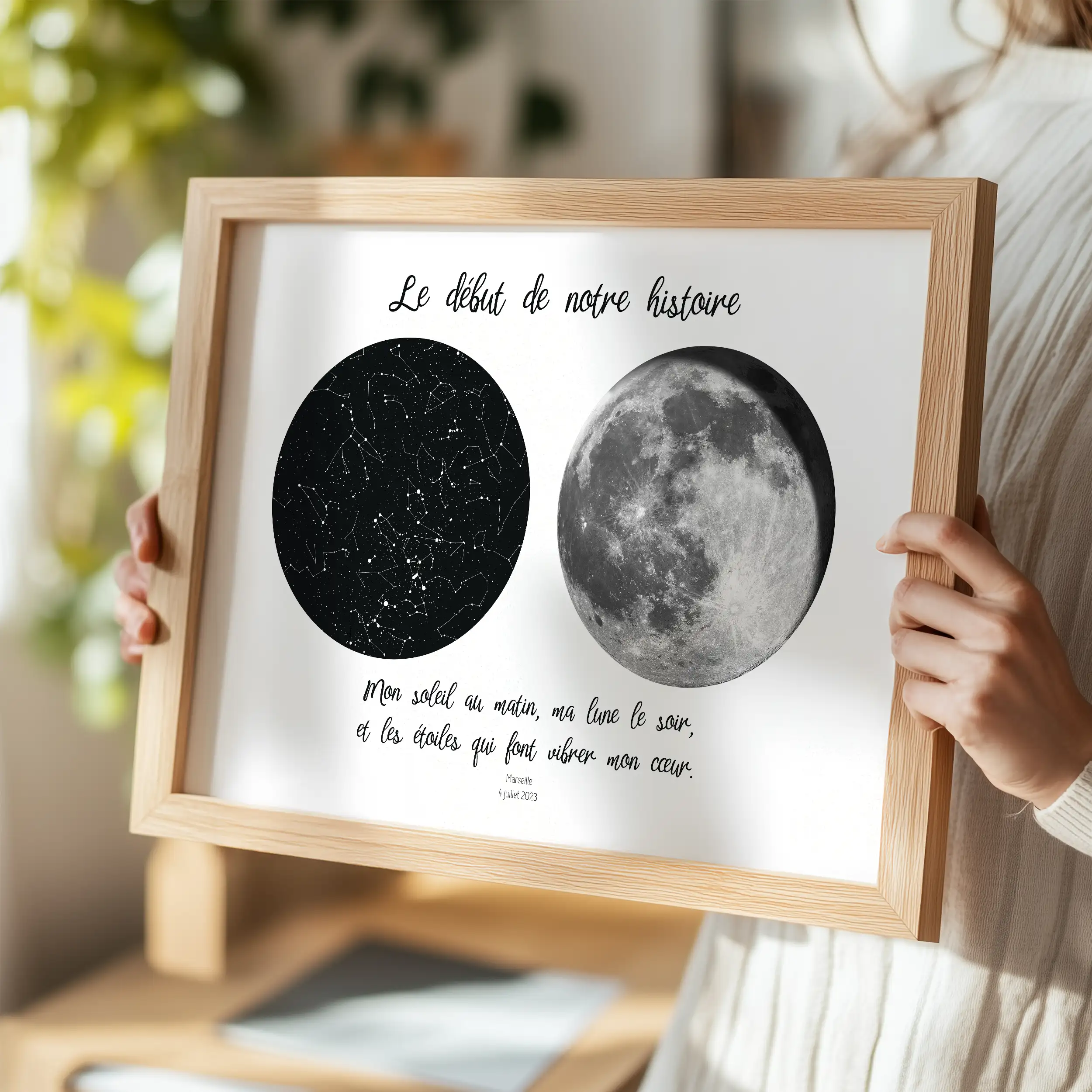 Célébrez un moment unique avec un cadeau romantique capturant la position de la lune et des étoiles à une date précise. Que ce soit pour votre anniversaire, votre mariage ou toute autre occasion spéciale, cette affiche personnalisée reflète fidèlement la phase de la lune et le ciel étoilé de cette nuit inoubliable