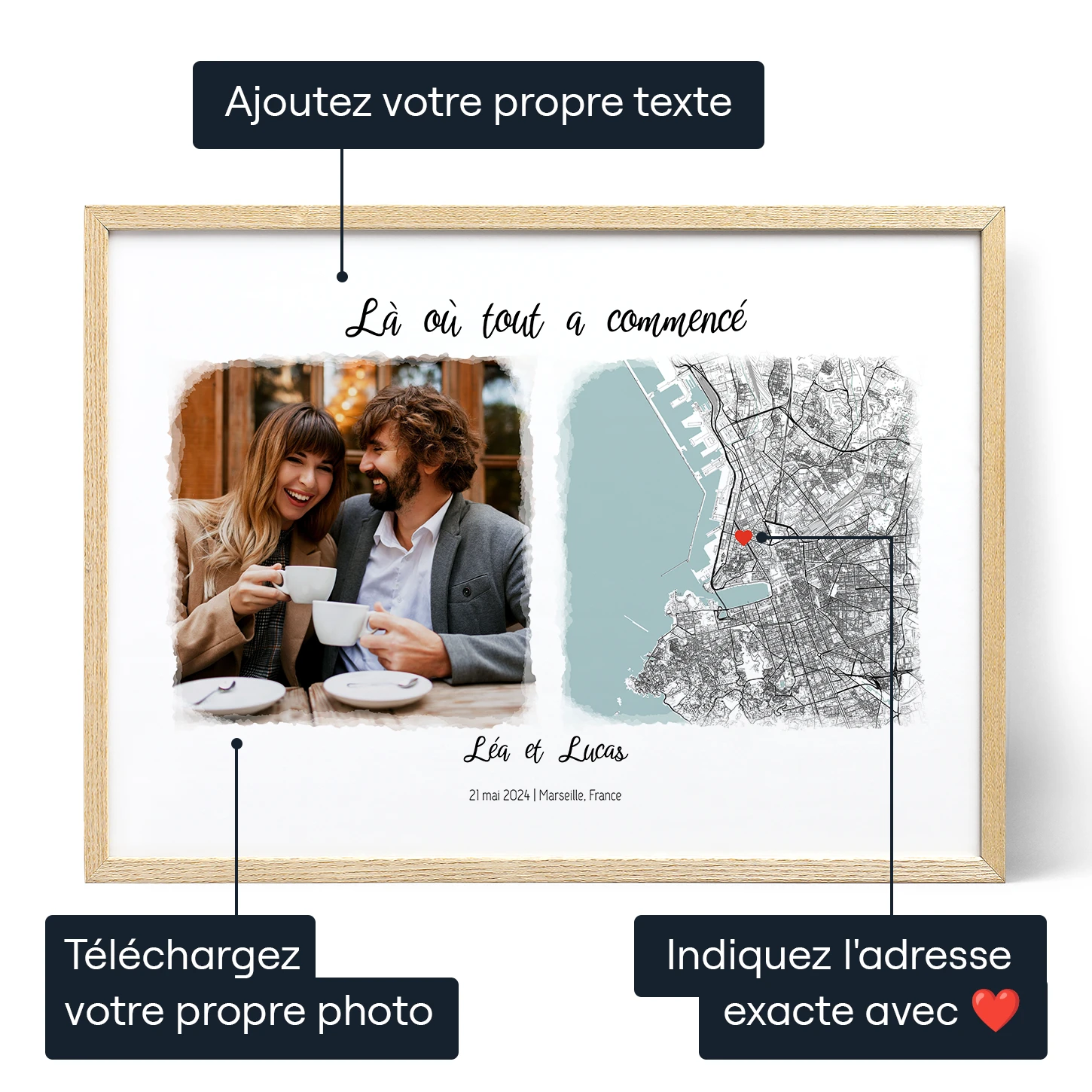 - Capturez ce moment spécial avec une carte et une photo personnalisées, indiquant l'emplacement exact des souvenirs précieux