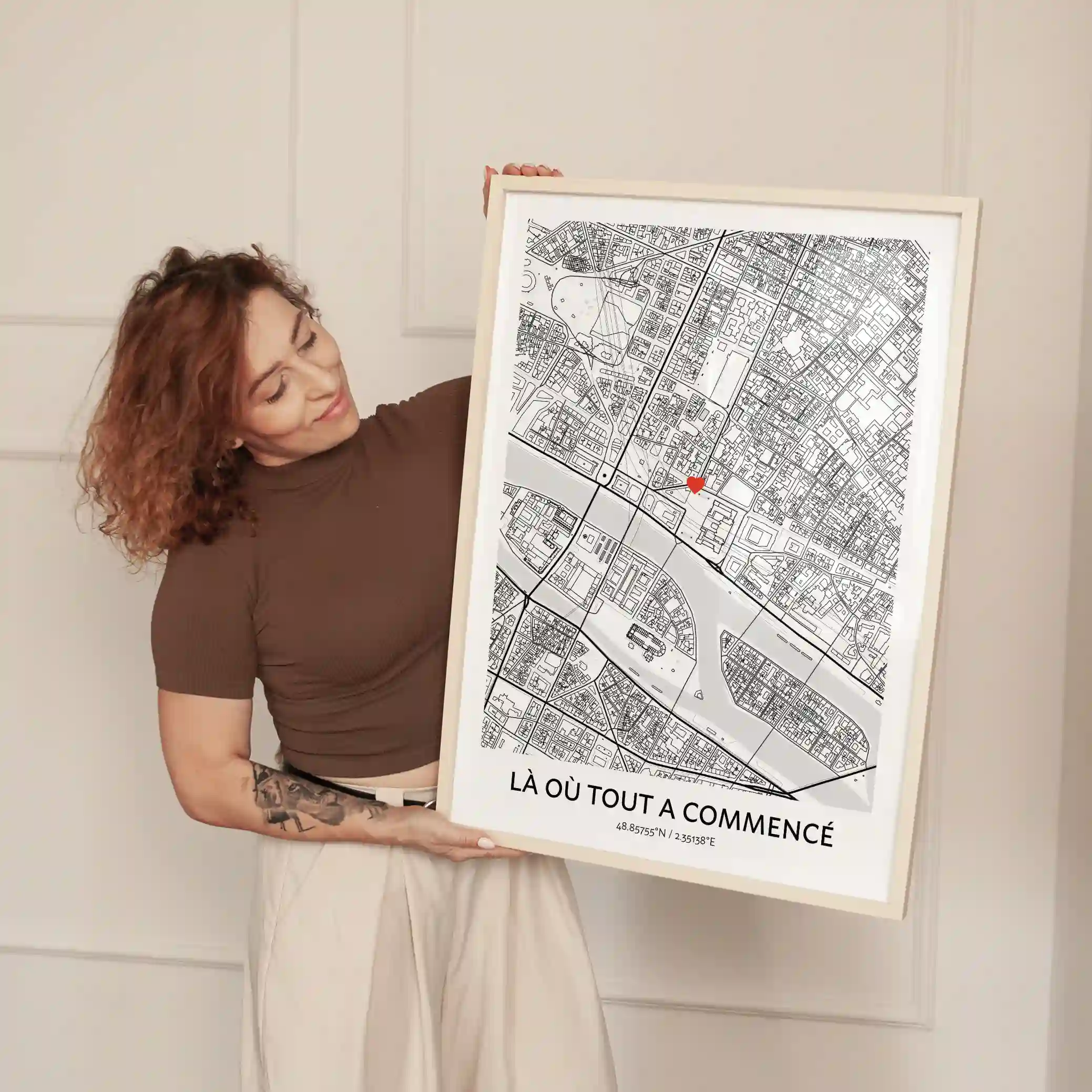 Une affiche Là où tout a commencé indique avec précision l’endroit exact où vous et votre amour vous êtes connus pour la première fois. Nos cartes utilisent des données GPS pour recréer une vue aérienne de l’emplacement de votre choix, qu’il s’agisse des rues animées de Paris ou de votre petite ville natale en Géorgie.