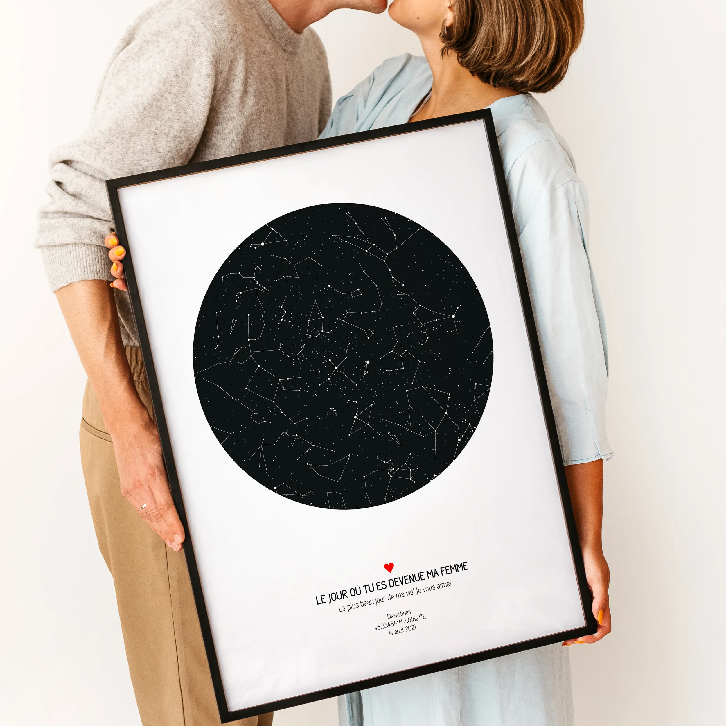 Une carte des étoiles personnalisée est un moyen idéal de montrer à votre femme à quel point vous l'aimez. C'est un cadeau unique et attentionné qui sera chéri pour toujours. Affichez-la chez vous avec fierté et ayez toujours une histoire à partager avec votre famille et vos amis.