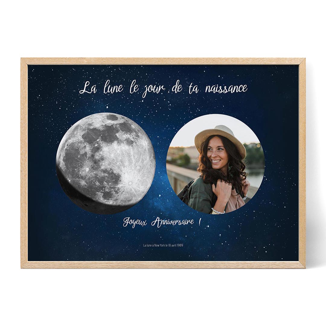 Vous cherchez un cadeau unique et sincère pour célébrer un anniversaire spécial ? La Lune d'Anniversaire avec Photo est une impression personnalisée ou une toile qui capture magnifiquement la magie de la phase de la lune du jour de la naissance de quelqu'un, accompagnée d'une photo précieuse. Cette œuvre d'art exquise est le moyen parfait de commémorer un anniversaire et de créer un souvenir durable qui sera chéri pour toujours.