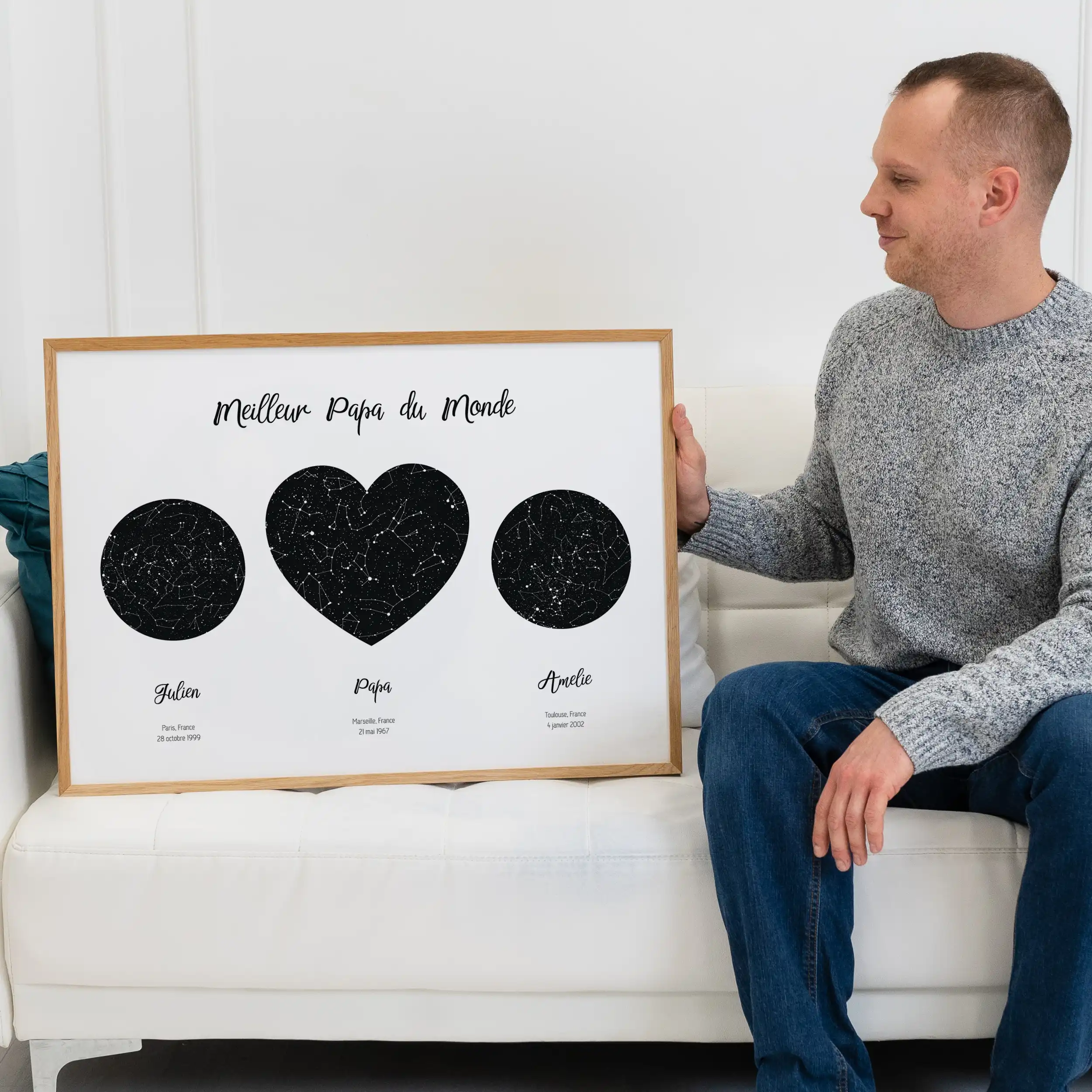 La Carte des Étoiles Triple pour Papa est le cadeau personnalisé ultime pour votre père à toute occasion spéciale ! Qu'il s'agisse de la Fête des pères, de son anniversaire ou de Noël, cette impression unique rendra sa journée inoubliable.