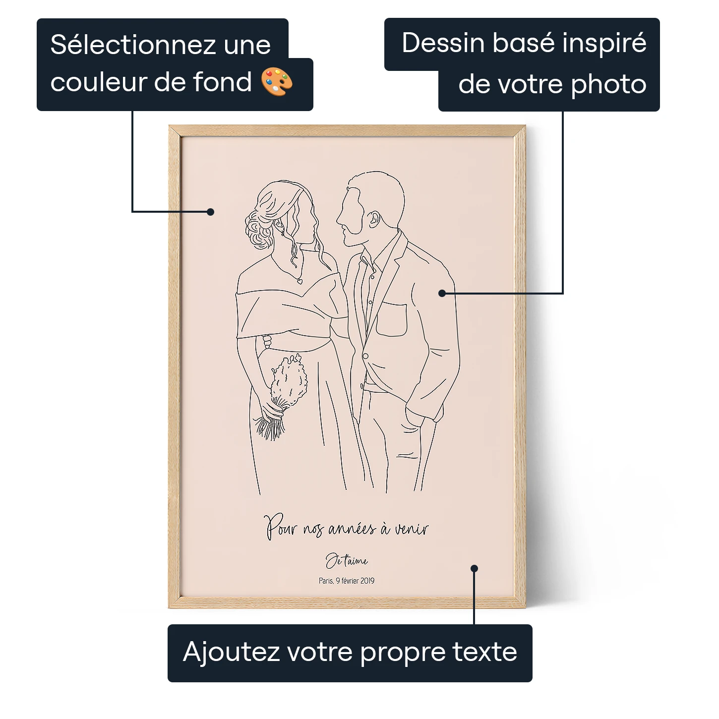 Partagez la photo qui renferme toute la magie de votre union. Nos artistes dessineront l'œuvre à la main avec grande précision, en veillant à ce qu'elle reflète la romance de cette journée singulière.