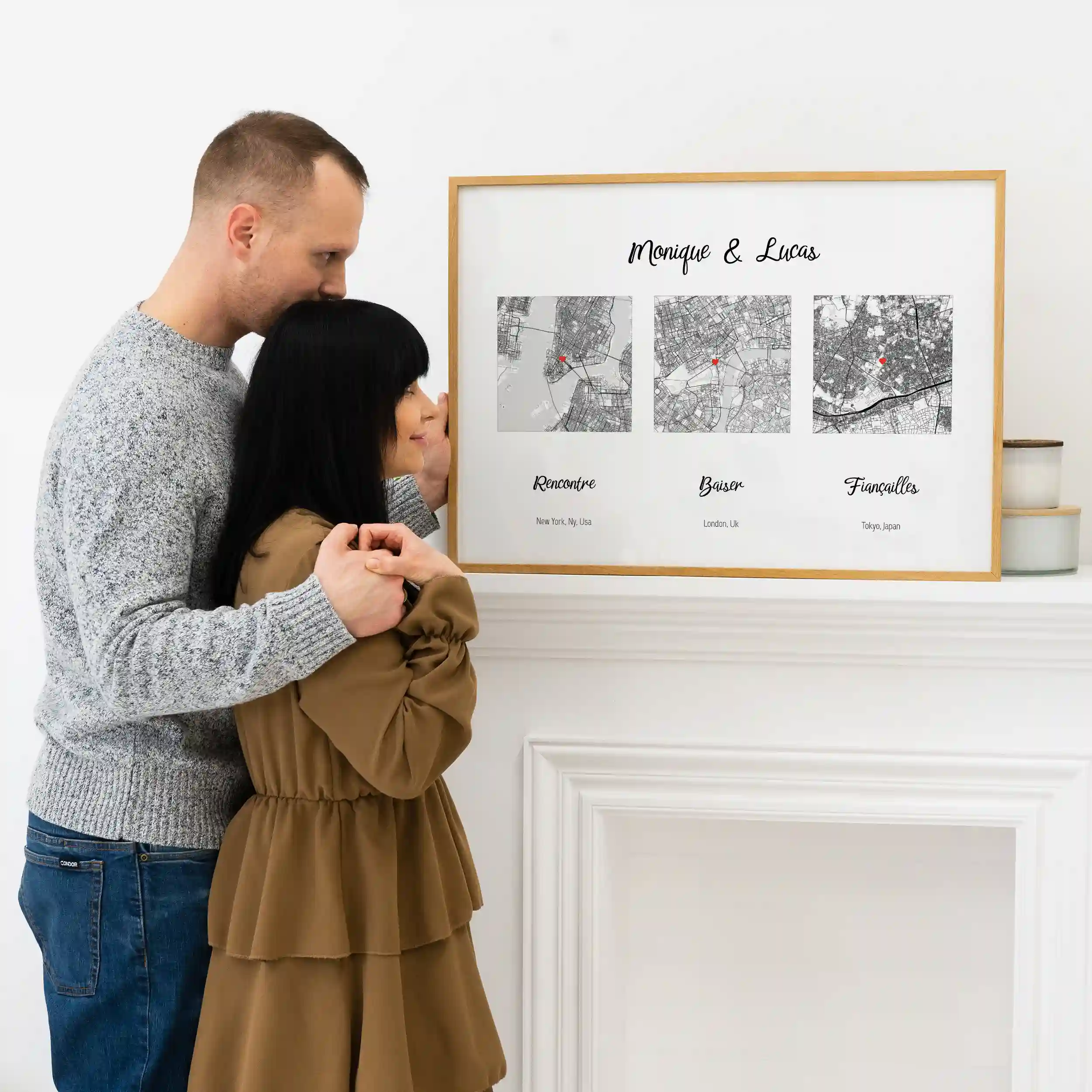 Nos cartes Rencontre, Baiser, Fiançailles de Positive Prints consistent en fait en une série de trois cartes plus petites affichées sous forme d'une seule affiche. Chaque carte met en évidence l'emplacement d'une étape importante de votre histoire d'amour : l'endroit où vous vous êtes rencontrés, où vous avez partagé votre premier baiser, et où vous avez décidé de passer votre vie ensemble.