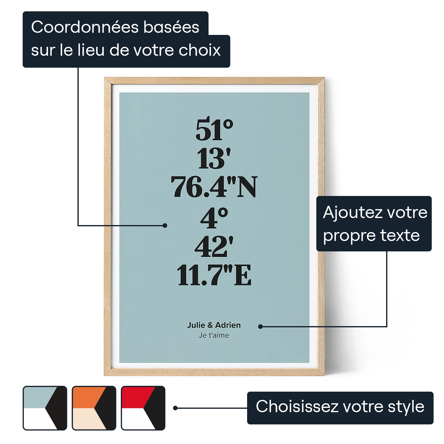 Vous choisissez votre lieu et notre technologie s'efforce de trouver les coordonnées exactes de votre lieu privilégié. Vous pourrez également choisir parmi un certain nombre de combinaisons de couleurs prédéfinies ou personnaliser les vôtres. Ajoutez des lignes de texte personnalisées pour partager ce qui rend ce lieu si important. N'oubliez pas que votre œuvre peut raconter votre histoire comme vous le souhaitez !