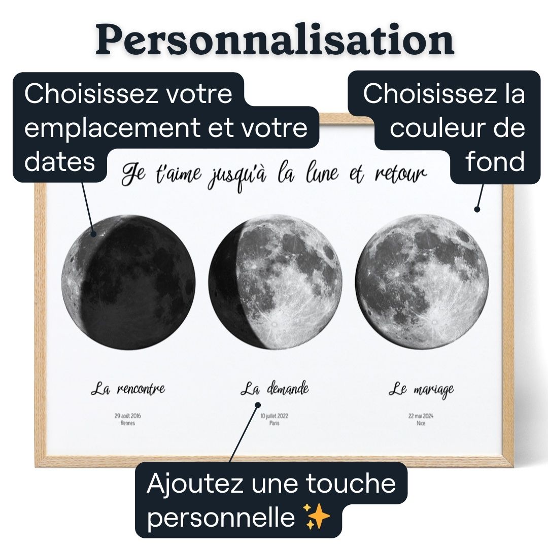 Ne tardez pas — transformez ces moments inoubliables en une œuvre d'art éblouissante que Maman chérira pour toujours. Commandez dès maintenant votre Trois Lunes pour Maman personnalisé et offrez un cadeau vraiment extraordinaire.