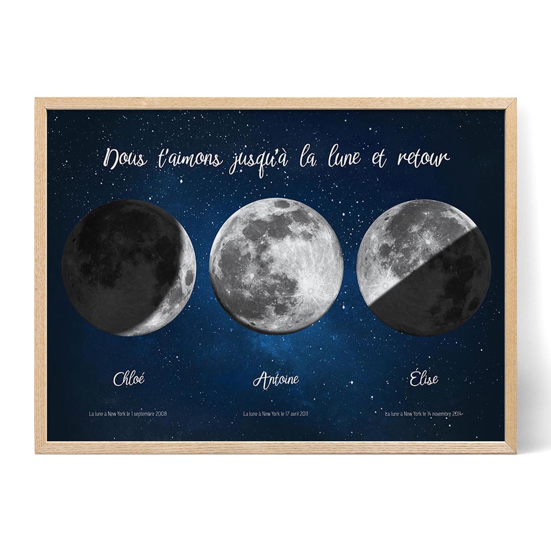 Après avoir défini le titre, entrez les dates et les lieux pour afficher les phases de la lune correspondant aux dates de naissance de chaque enfant. En dessous de chaque phase de la lune, vous pouvez ajouter des noms, des dates de naissance ou tout autre texte pour la personnaliser encore plus. Enfin, choisissez le format de votre œuvre. Nous proposons divers formats et styles, y compris des affiches imprimées ou encadrées, des toiles et des téléchargements numériques instantanés.