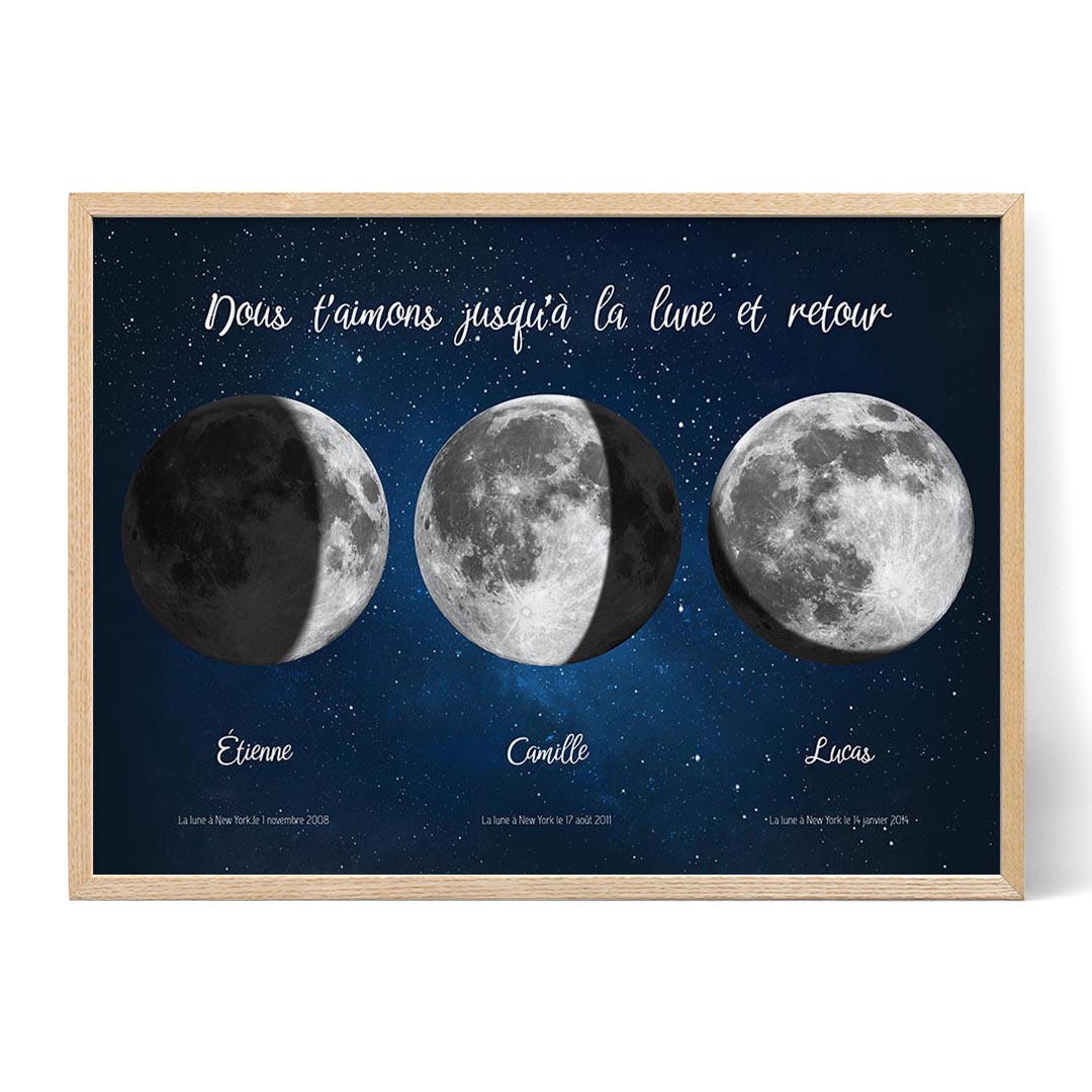 Après avoir défini le titre, entrez les dates et les lieux pour afficher les phases de la lune correspondant aux dates de naissance de chaque petit-enfant. En dessous de chaque phase de la lune, vous pouvez ajouter des noms, des dates de naissance ou tout autre texte pour la personnaliser encore plus. Enfin, choisissez le format de votre œuvre. Nous proposons divers formats et styles, y compris des affiches imprimées ou encadrées, des toiles et des téléchargements numériques instantanés.