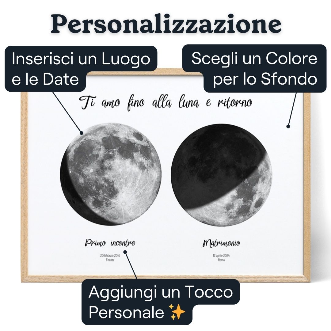 Una volta impostato il titolo, inserisci le date e i luoghi per ciascuna fase lunare. Questo rivelerà come appariva la luna nei giorni in cui tu e la tua anima gemella siete nati. Sotto ogni luna, puoi aggiungere nomi o qualsiasi altro testo preferisci. Infine, seleziona il formato della tua opera. Offriamo varie dimensioni e stili, tra cui stampe o manifesti incorniciati, tele e download digitali istantanei.