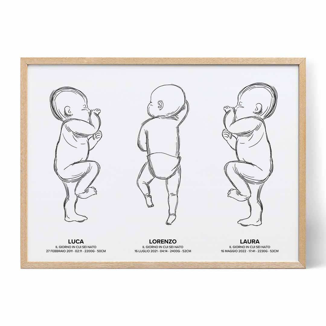 Non c'è niente di più speciale che assistere alla nascita di un bebè, soprattutto se si tratta del tuo primo bambino. Se poi la cicogna vi ha consegnato una tripletta: che gioia! Per non dimenticare le emozioni di questa giornata così importante, abbiamo pensato di darti la possibilità di personalizzare un quadro nascita. La stampa dei tuoi bebè in scala 1:1 ti farà rivivere per sempre il momento in cui hai visto i tuoi figli per la prima volta.