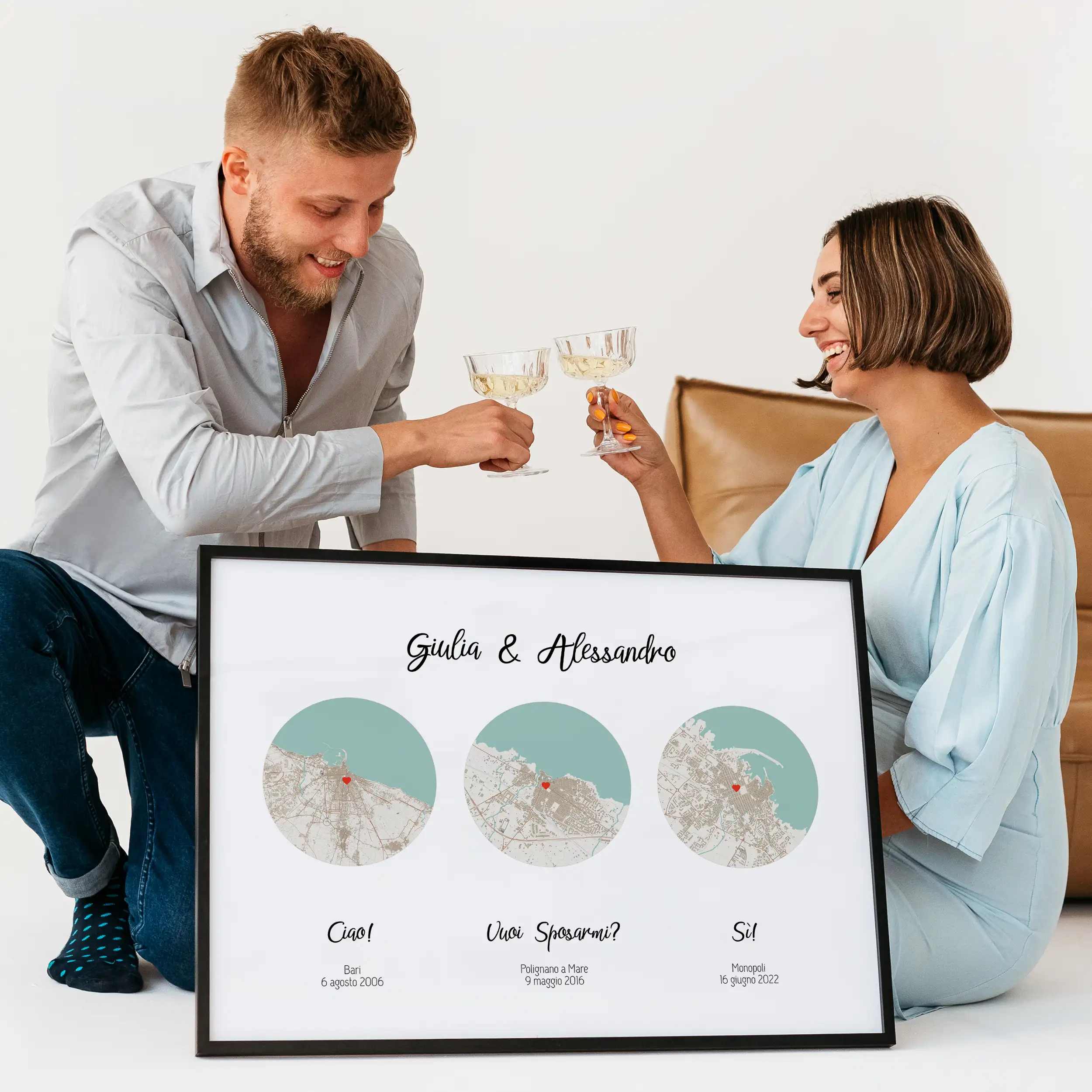 Ogni traguardo è stato raggiunto in un momento e in un luogo preciso, ma con Ciao! Vuoi Sposarmi? Lo Voglio, non importa dov’è avvenuta la magia, perché con una mappa tripla come questa puoi mettere nero su bianco tutti gli eventi più importanti e riassaporarli per tutta la vita.