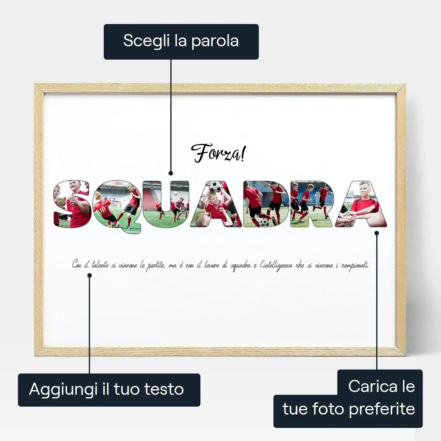 Sei pronto a regalare un dono che sarà apprezzato per sempre? Il nostro Collage di Foto a Forma di Lettere della Squadra Sportiva è la scelta perfetta per qualsiasi occasione. Che sia la fine della stagione, una sorpresa di Natale, una festa di compleanno, o semplicemente per mostrare la tua gratitudine, questo capolavoro personalizzato delizierà i tuoi colleghi, fan dello sport, squadra o allenatore. Trasforma la tua parola preferita in un magnifico collage pieno di ricordi preziosi. Tuffati nel nostro editor online e inizia a creare il tuo capolavoro fotografico a forma di lettera unico oggi stesso!