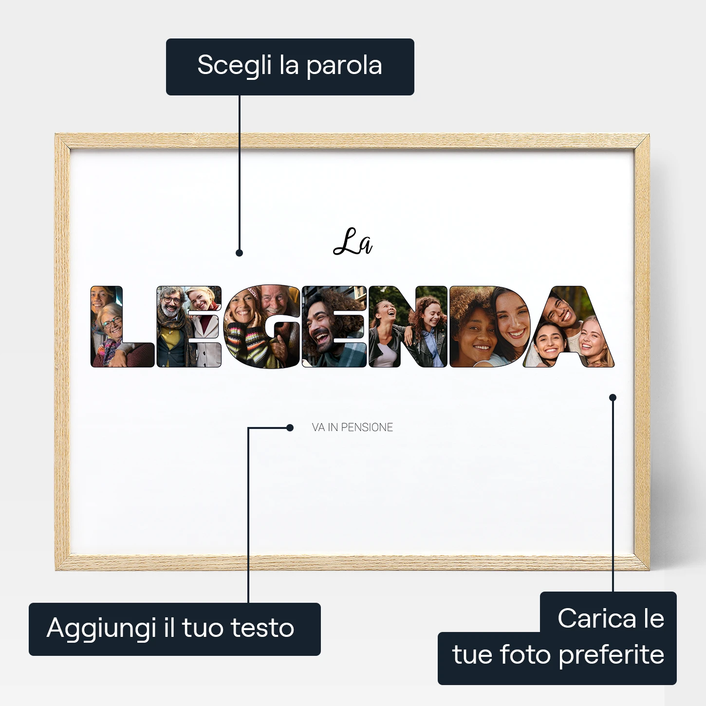 Stai cercando un regalo di pensionamento sincero per un collega o un capo? Il nostro "Collage di Foto a Forma di Lettere "La Leggenda Si È Ritirata"" è la scelta perfetta. Puoi personalizzarlo riempiendo la parola scelta (ad esempio, "leggenda", "ritirato" o "squadra") con le tue foto più care. Il nostro editor online facile da usare ti permette di personalizzare ogni dettaglio, dal colore del contorno di ogni lettera all'aggiunta di testo superiore e inferiore per un tocco personale. Carica una foto per ogni lettera e disponile come preferisci. Infine, seleziona il formato preferito: incorniciato, poster stampato, tela o un file digitale da scaricare istantaneamente.