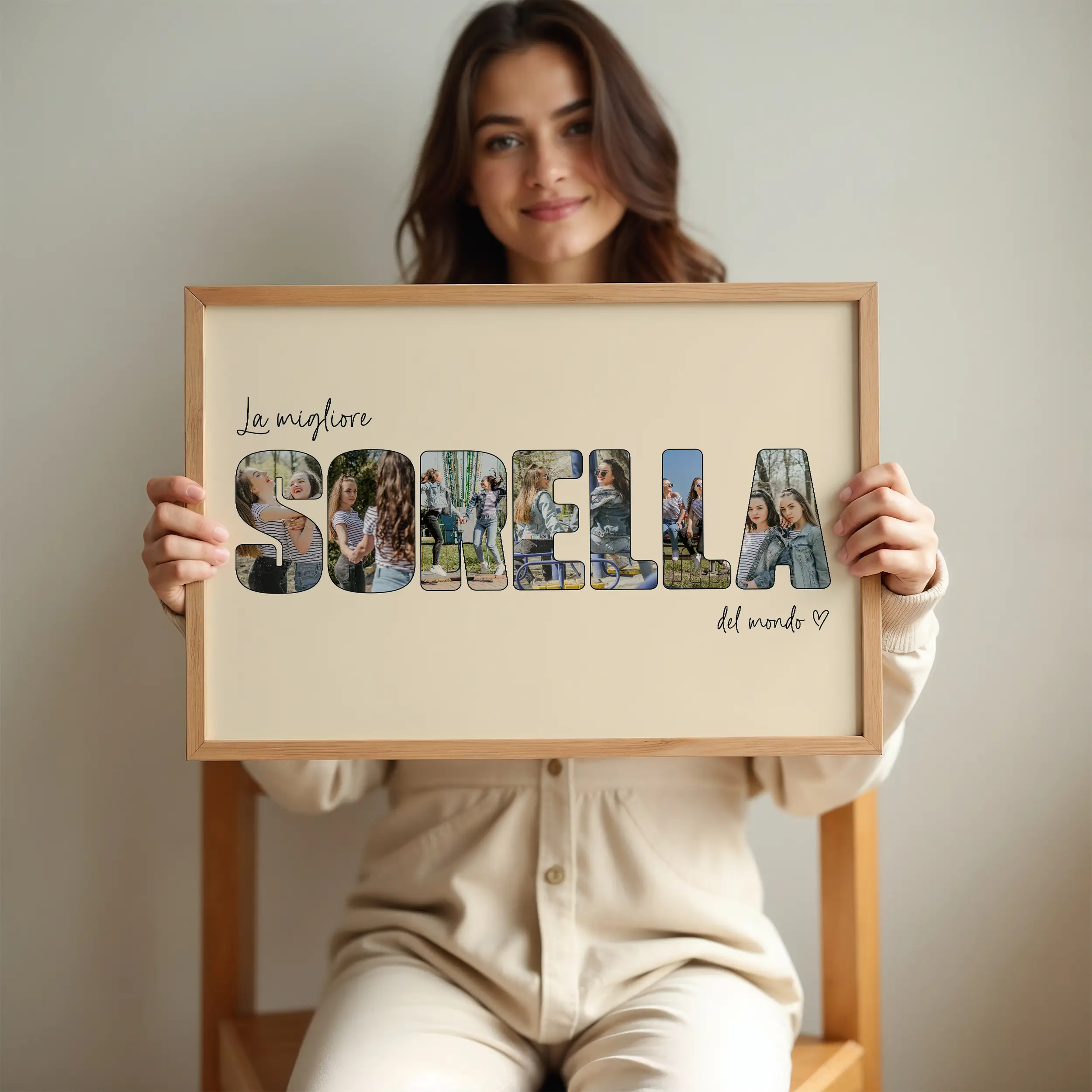 Con il Collage di Foto a Forma di Lettere per Sorelle hai la possibilità di creare un regalo originale e personalizzato per tua sorella. Che tu voglia regalarglielo in occasione del suo compleanno, del Natale o per stupirla in un giorno qualsiasi, il Collage di Foto a Forma di Lettere per Sorelle è un modo dolcissimo di mostrare il tuo affetto ed esporre i vostri ricordi più preziosi. Scegli una parola che rappresenti al meglio il vostro legame, come “sorellina”, “sorellona” o qualsiasi altro soprannome. Le possibilità sono infinite: tutto dipende dalla tua creatività! Quello che rende questo regalo davvero unico nel suo genere è il fatto di poter decorare ogni lettera con una foto diversa.