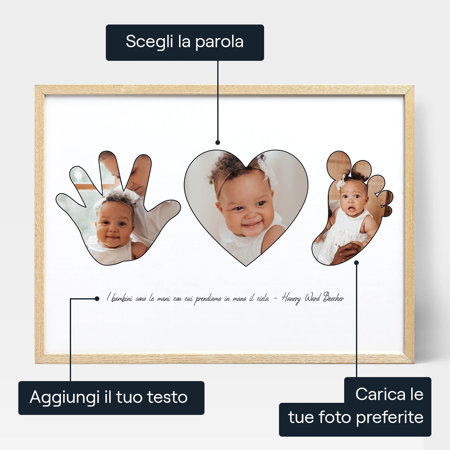 Una volta finalizzato il tuo layout, puoi cominciare a caricare le tue foto. Carica una foto per ogni simbolo e il nostro editor ti permetterà di ingrandire e regolare la loro posizione. Dopodiché, per personalizzarlo al massimo, potrai anche aggiungere un tuo messaggio subito sotto le foto. Infine, scegli la dimensione e il formato che desideri. Che tu preferisca un poster incorniciato, una tela stampata o un file di download digitale istantaneo, il Collage di Foto per un Bebè arriva come vuoi tu.