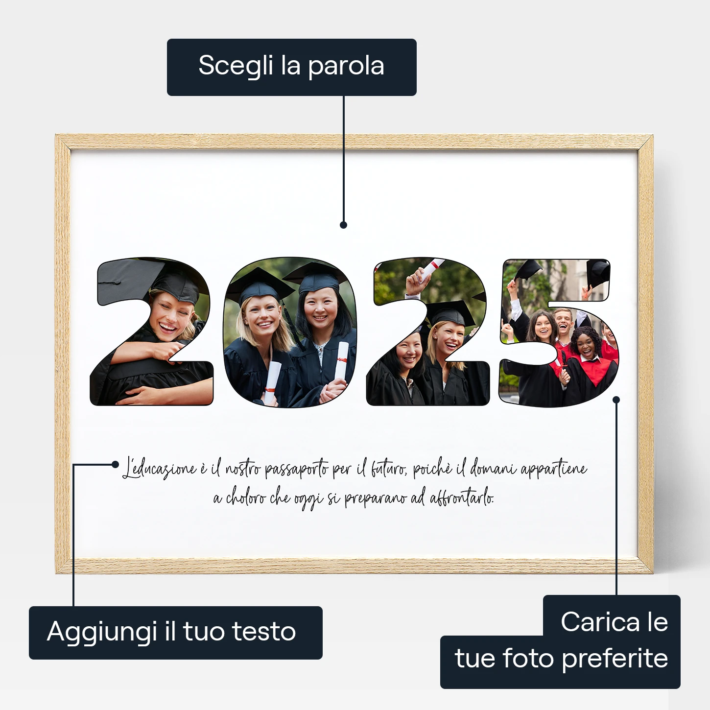 Positive Prints utilizza esclusivamente materiali di alta qualità e tecnologia all’avanguardia, per assicurarti un Collage Fotografico di Laurea elegante e professionale. È il modo perfetto per celebrare il giorno speciale di una laurea e commemorare gli anni e l’impegno per raggiungere questo traguardo.