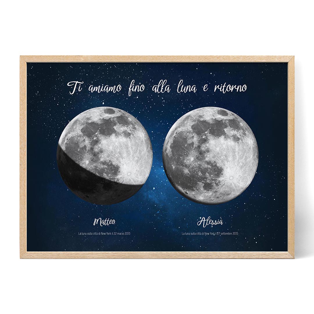 Pronto a creare un regalo memorabile per la nonna? Inizia a personalizzare ora la tua opera d'arte Due Lune per Nonna. Visita il nostro editor online e inizia scegliendo uno sfondo. Aggiungi un titolo sentito, inserisci le date e i luoghi per vedere le fasi lunari e personalizza il testo sotto ogni luna. Seleziona il formato che meglio si adatta allo stile della tua nonna e sei a posto!
