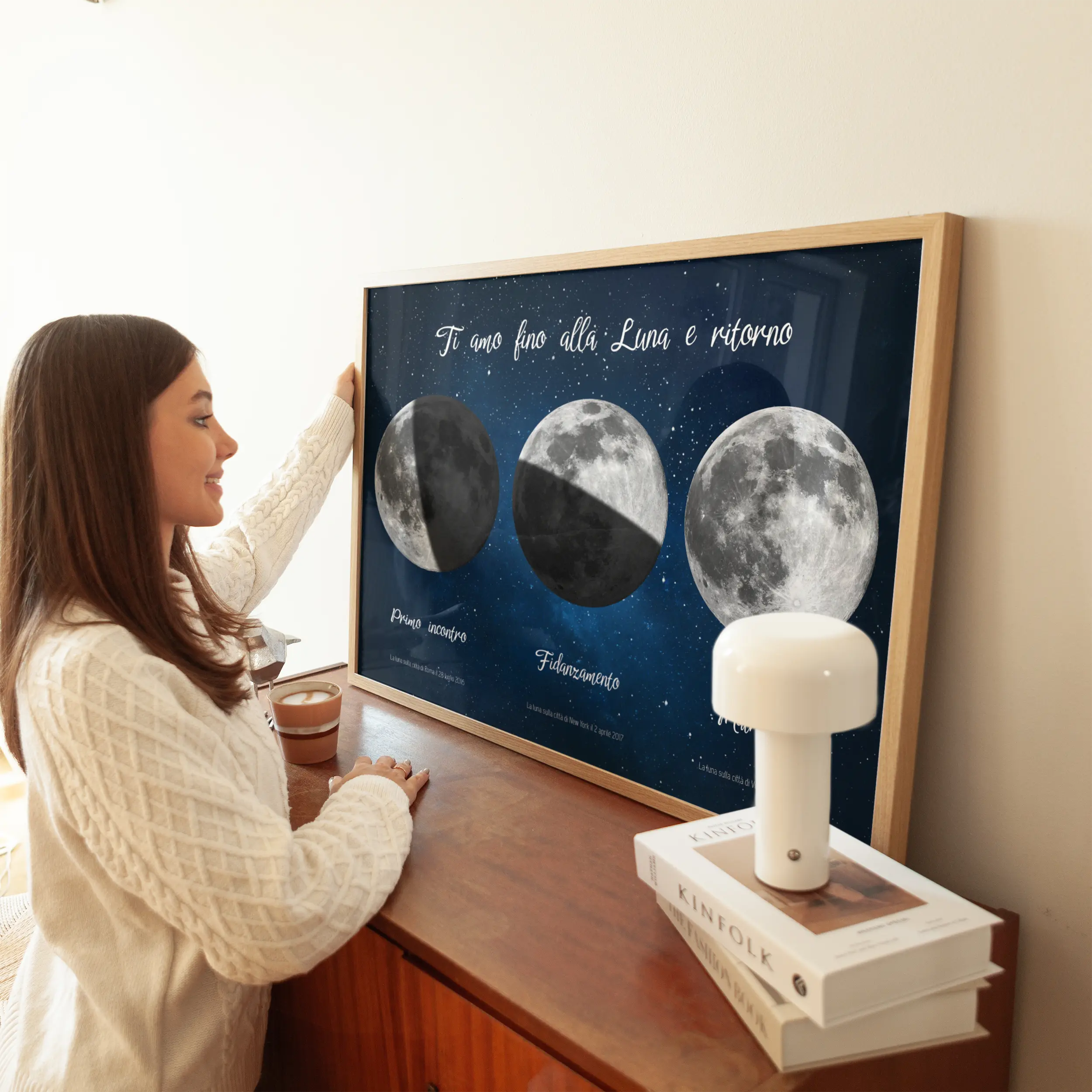 Cerchi un regalo unico e significativo per la persona amata? Il nostro poster "Fase di Luna Tripla" è la scelta perfetta. Questa stampa personalizzata presenta tre fasi lunari affiancate, catturando momenti speciali della tua vita in modo bello e memorabile.