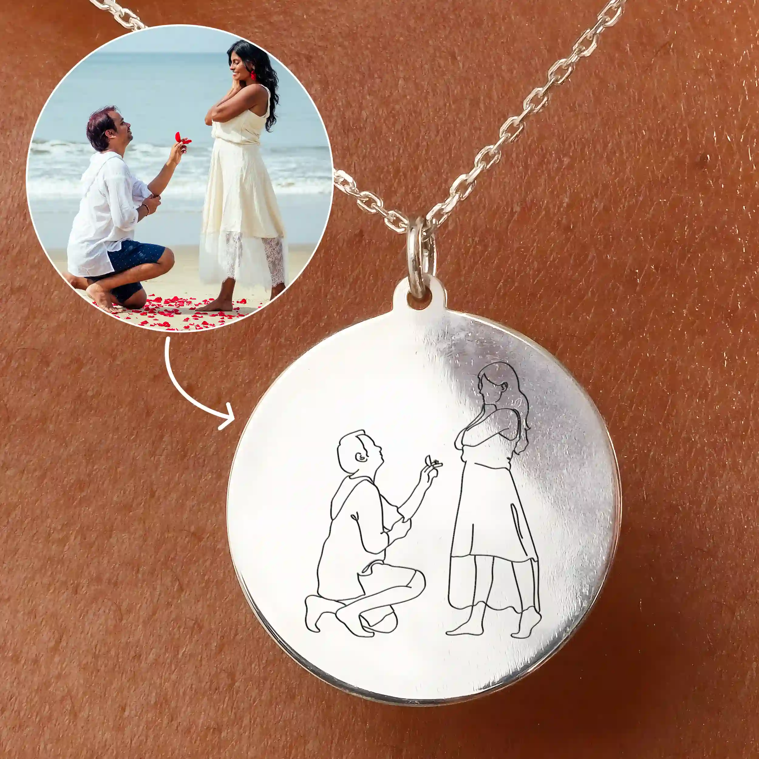 Con i nostri Gioielli Lineart per Fidanzamento, ogni ciondolo è unico. I nostri artisti talentuosi disegnano a mano ogni design dalla tua foto, creando bellissime opere d'arte minimaliste. Sul retro, puoi aggiungere un messaggio personalizzato come la data del tuo fidanzamento o una nota personale come "Per Sempre Tua".
