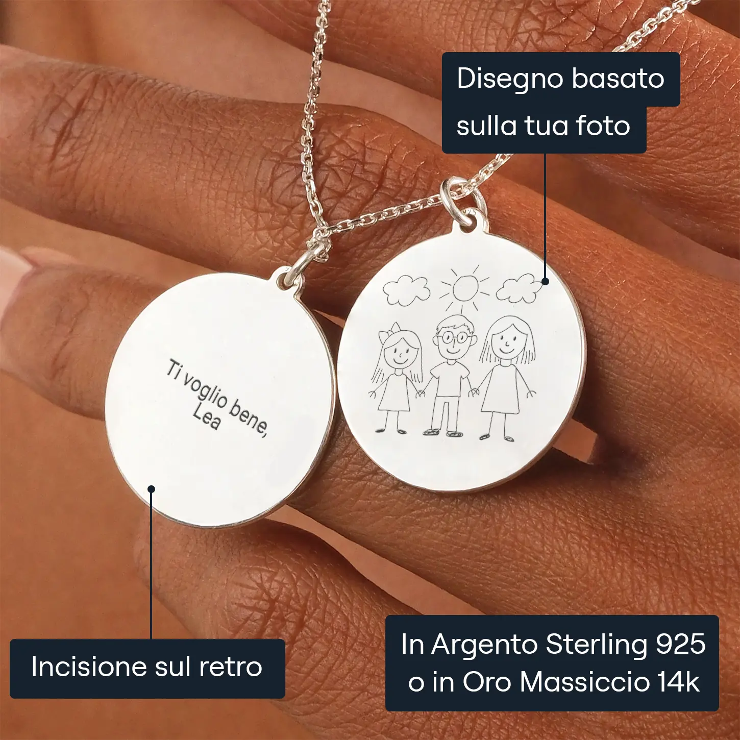 Cerchi un regalo unico e sentito? I nostri Gioielli Personalizzati con Disegno di Bambino sono la scelta perfetta. Trasforma l'opera d'arte preziosa di tuo figlio in un magnifico pendente con incisione personalizzata.