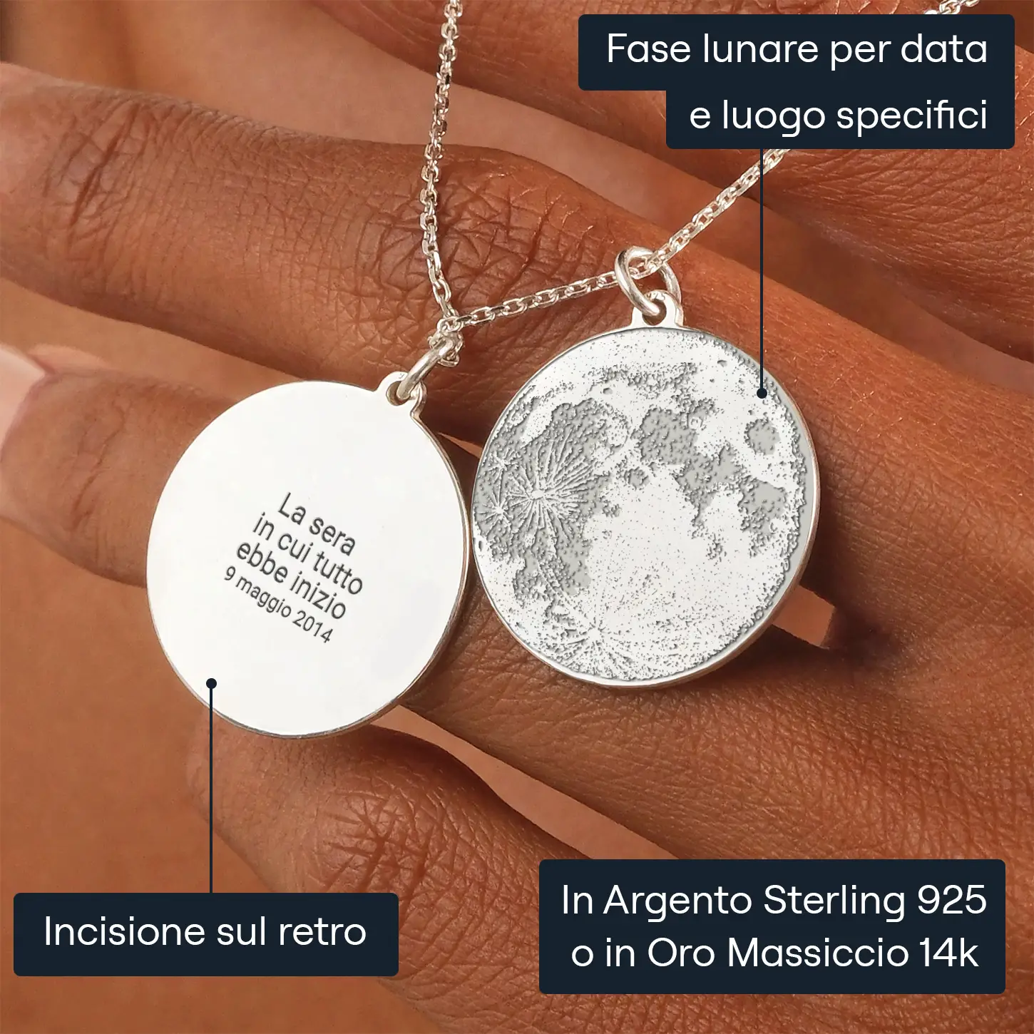 I nostri Gioielli Personalizzati con Fasi Lunari ti permettono di creare un pendente unico nel suo genere che racconta la tua storia unica. Utilizzando il nostro editor online, inserisci semplicemente l'ora esatta e la data del tuo momento speciale. Che sia il giorno in cui hai incontrato la tua anima gemella, la data del tuo matrimonio o qualsiasi altra occasione memorabile, cattureremo la fase lunare di quel preciso istante.