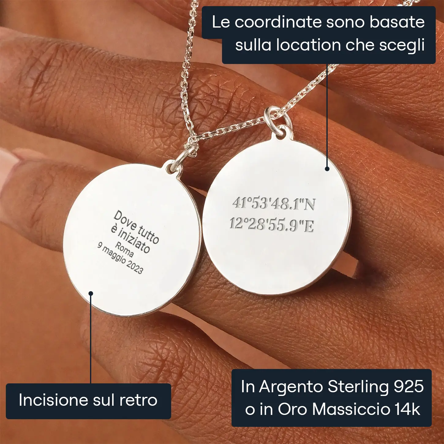 Con i nostri Gioielli Personalizzati delle Coordinate, puoi catturare l'esatto punto in cui i tuoi momenti più preziosi si sono svolti. Utilizzando il nostro intuitivo editor online, basta scegliere la posizione desiderata e incideremo le sue coordinate sul fronte del tuo ciondolo.