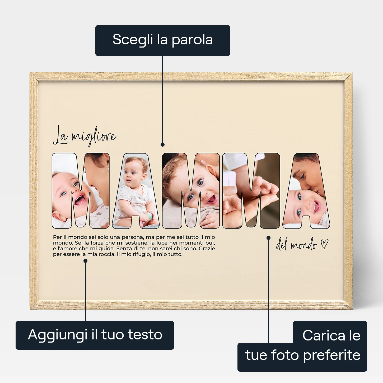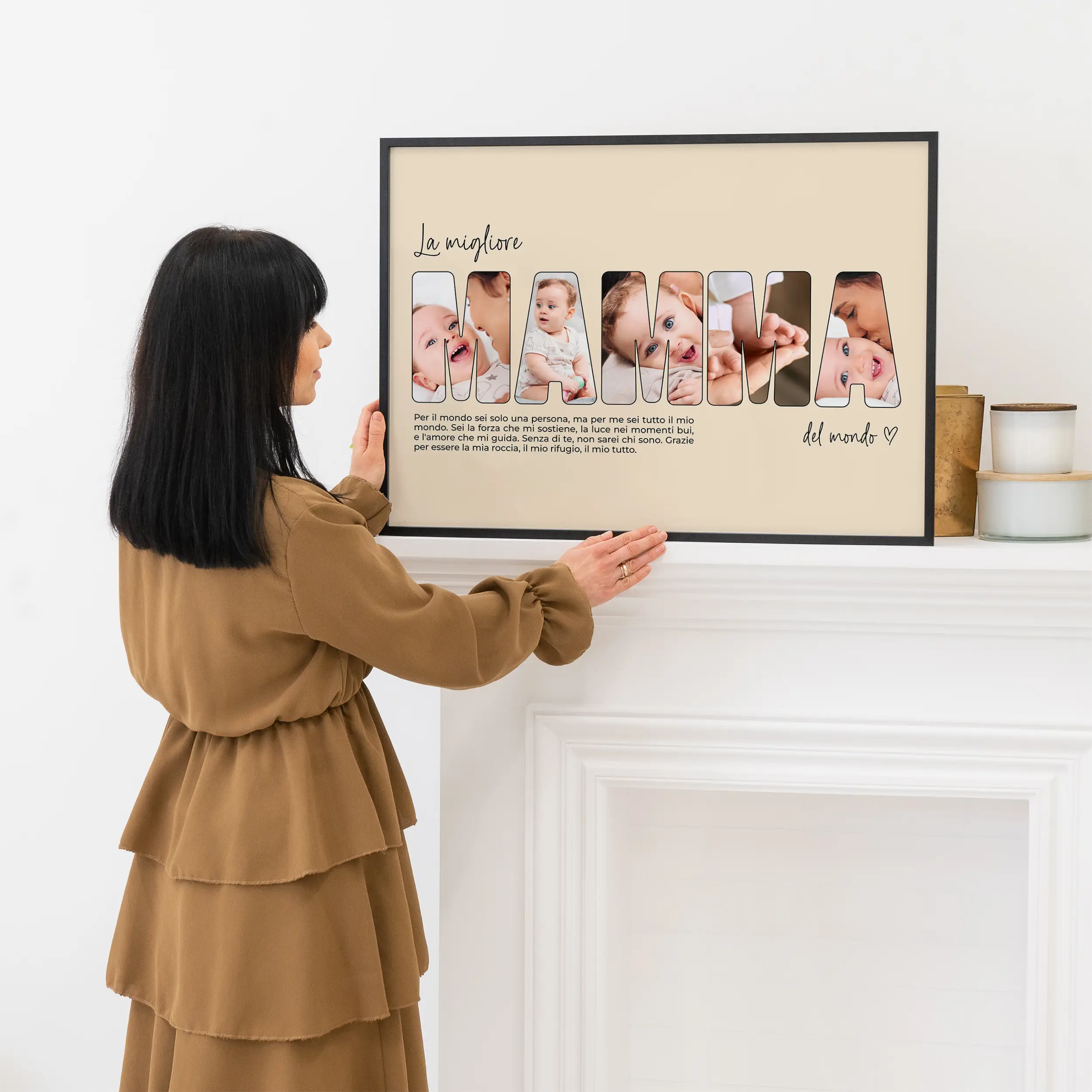 Celebra la donna più importante della tua vita, la tua Mamma, con un regalo personalizzato e pieno d'amore. Scegli le foto dei momenti più significativi che avete condiviso insieme e crea un poster che dimostra quanto lei sia speciale per te.