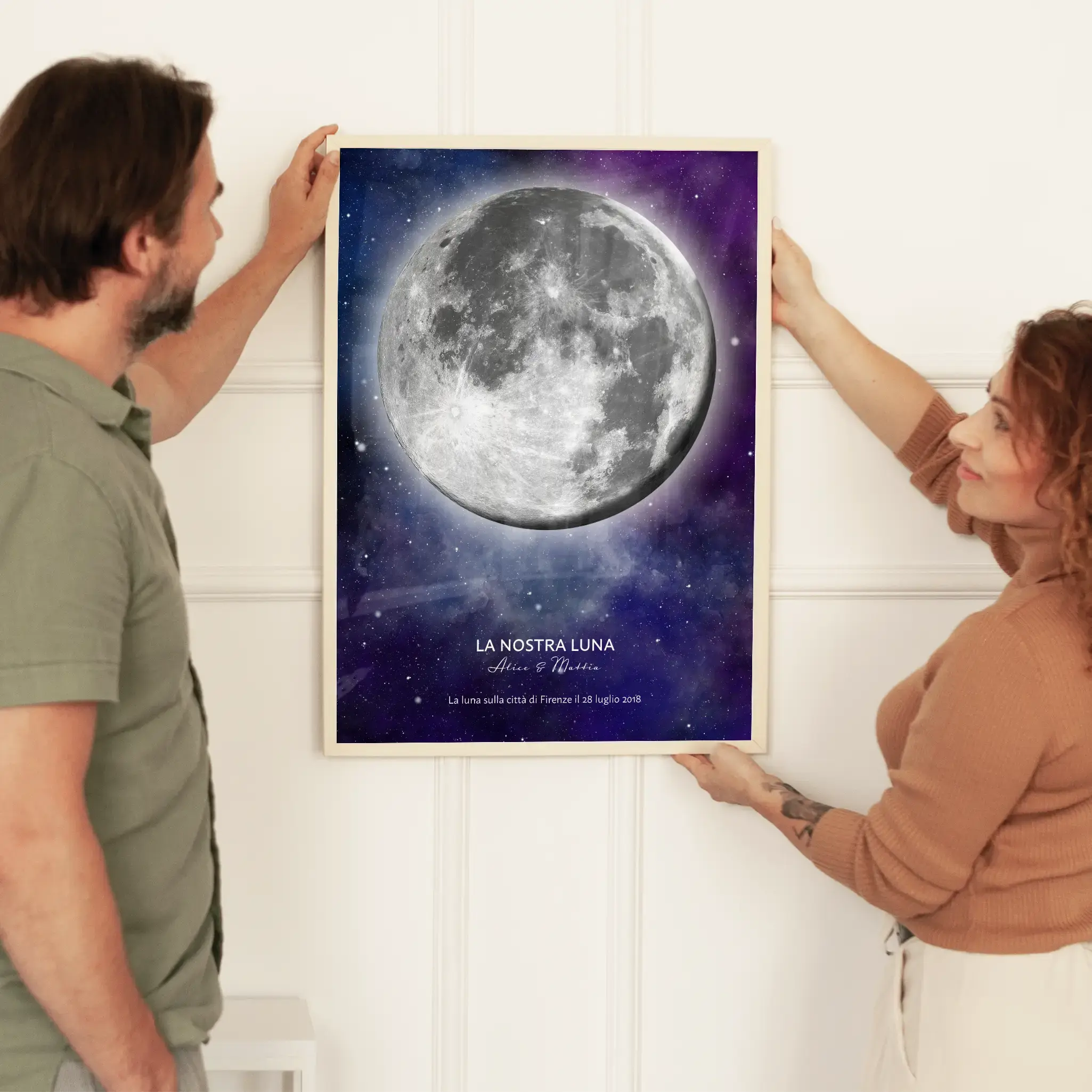 I nostri poster delle fasi lunari ricreano l’aspetto che aveva la luna in una data a tua scelta. Che sia quella in cui vi siete conosciuti, quella in cui è iniziata la vostra storia d’amore o quella in cui avete pronunciato il fatidico “Lo voglio”, la scelta è solo tua. Il nostro compito è quello di rendere indelebile un ricordo speciale e far in modo che tu possa sempre guardare a quel ricordo con gioia.