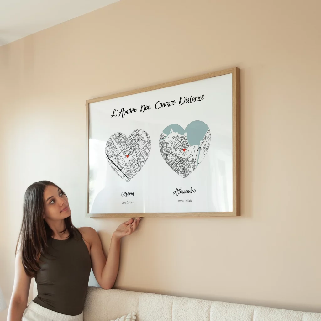 Non importa quanti chilometri ci siano tra di voi, questa stampa continuerà a testimoniare la forza del vostro amore. L’amore non conosce distanze e questa mappa personalizzata è il modo perfetto per ricordare a entrambi questa verità!