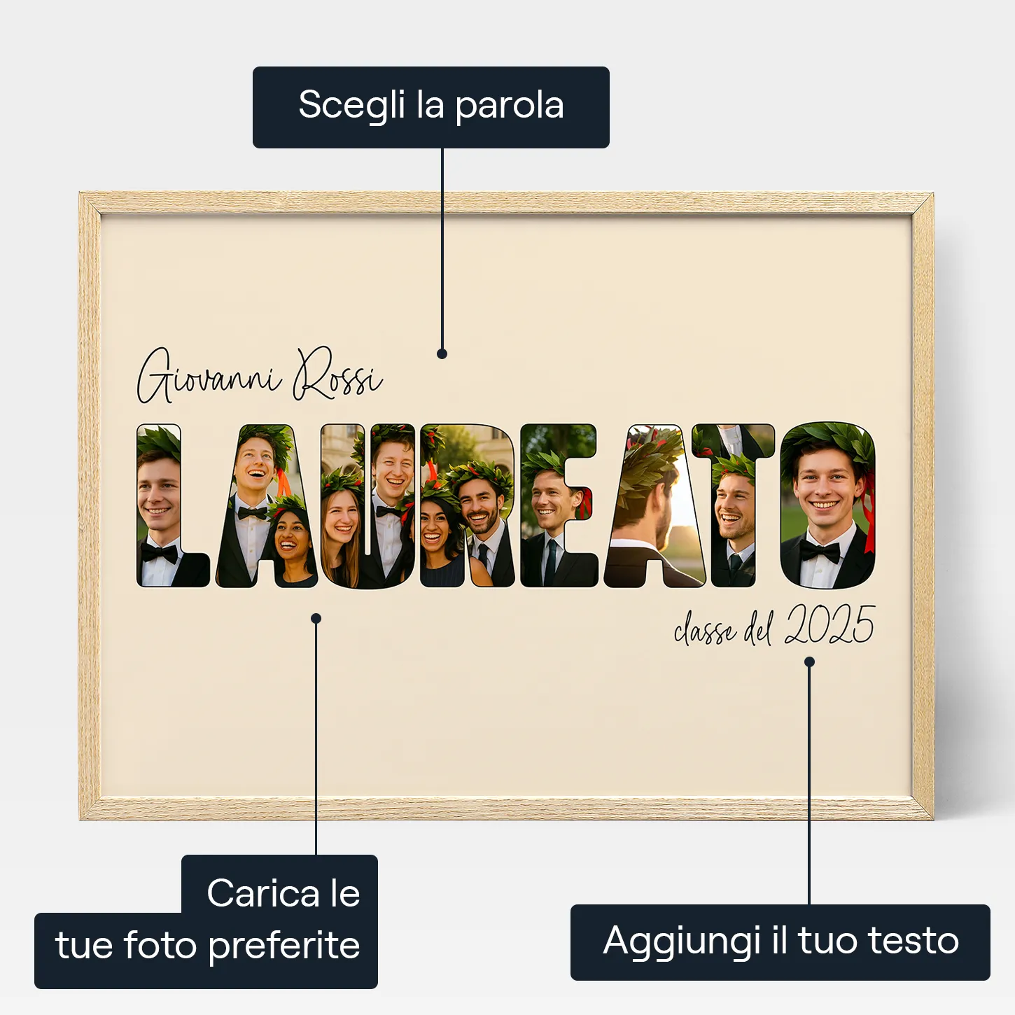 Offriamo la personalizzazione gratuita su ogni ordine, così ogni prodotto è unico e perfettamente in linea con le tue preferenze. Il nostro editor online, facile e intuitivo, ti permette di creare la tua opera d’arte personalizzata in pochi passaggi, sia da computer che da cellulare. E con l'anteprima interattiva, puoi vedere il risultato in tempo reale e perfezionare ogni dettaglio prima dell'acquisto.