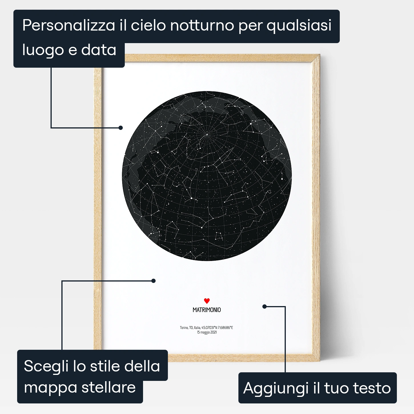 Grazie al nostro editor online puoi creare la tua mappa stellare in modo semplice e veloce: abbiamo eliminata ogni passaggio superfluo! Il primo passo è scegliere uno dei 7 design disponibili o selezionare l’opzione ‘personalizza’ per creare la tua combinazione di colori. Poi, con un semplice clic, puoi decidere quanti dettagli includere sulla tua mappa: potresti far comparire i pianeti, le costellazioni, la Via Lattea e molto altro ancora.