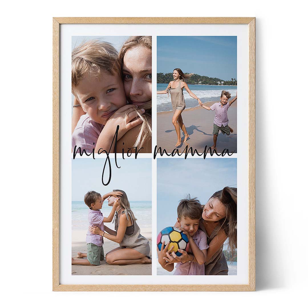 Successivamente, aggiungi quattro delle tue foto preferite al tuo collage. Dalle vacanze in famiglia ai momenti quotidiani, queste foto daranno vita al tuo collage e creeranno una rappresentazione significativa del tuo legame con tua mamma. Il nostro intuitivo editor ti permette di caricare e disporre facilmente le tue foto per il layout perfetto. Infine, scegli come desideri che il tuo collage venga mostrato. Che tu preferisca un poster stampato o incorniciato, una stampa su tela o un file di download digitale istantaneo, offriamo una varietà di opzioni per soddisfare le tue esigenze.