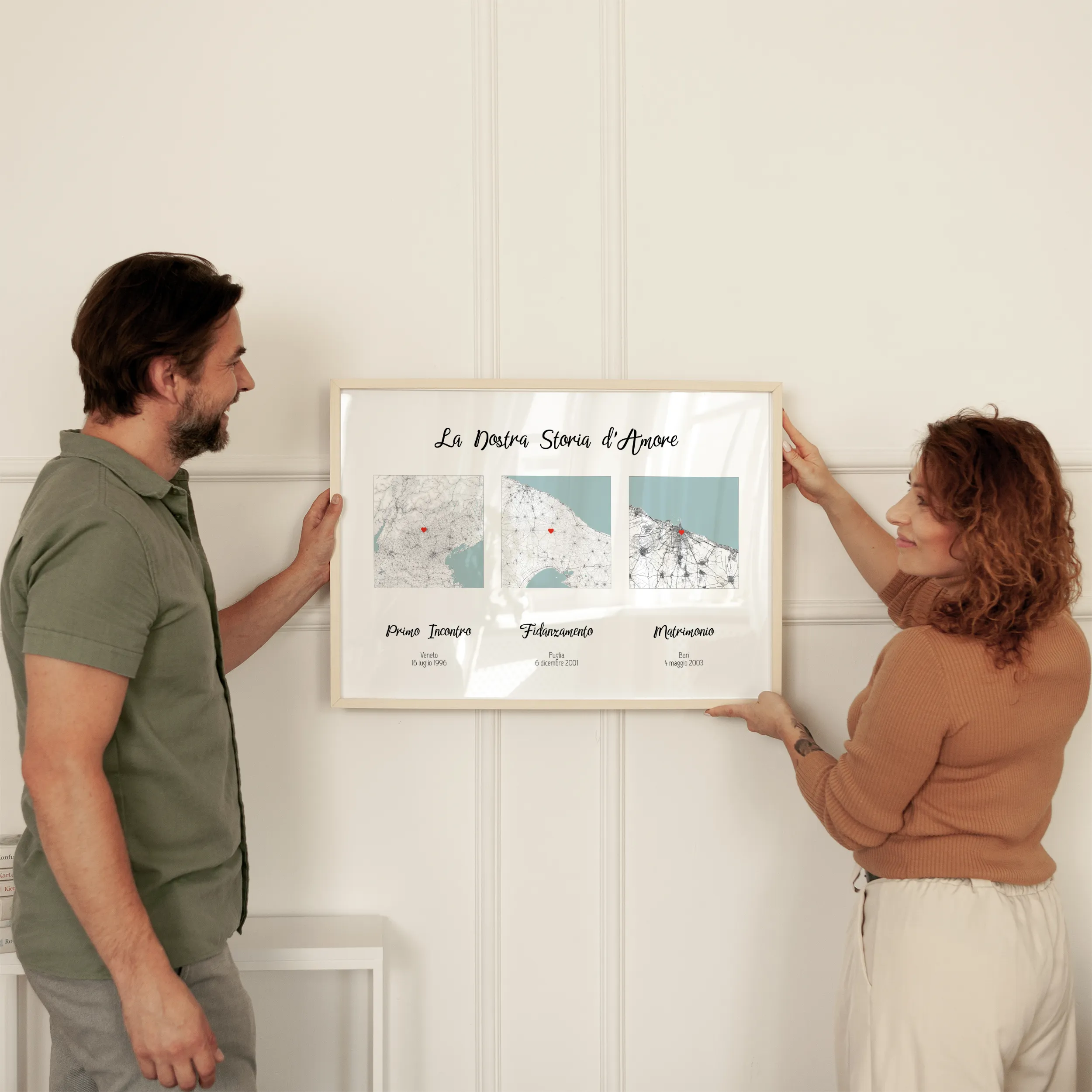 Racchiudi i momenti più belli della tua storia d'amore in un poster personalizzato. Una Mappa della Nostra Storia d'Amore è un modo romantico per raccontare tre eventi che hanno segnato il vostro percorso insieme.