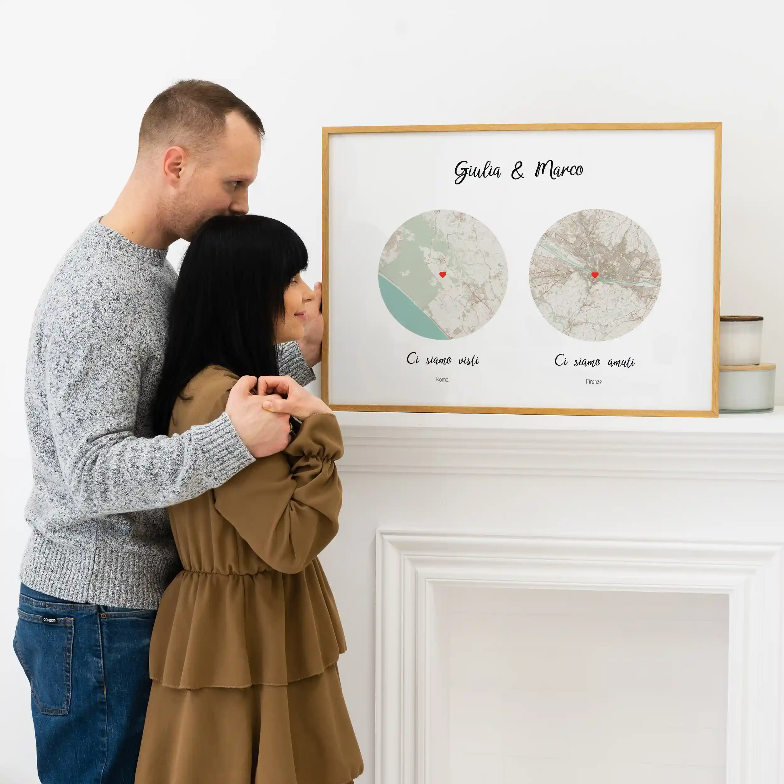 Infine, scegli come desideri stampare la tua mappa – con o senza cornice, su tela o riceverlo come file digitale da far stampare in una copisteria della tua zona. Seguendo questi semplici passaggi, riuscirai a personalizzare la tua Mappa Doppia del Nostro Incontro e a catturare l’essenza del vero amore.