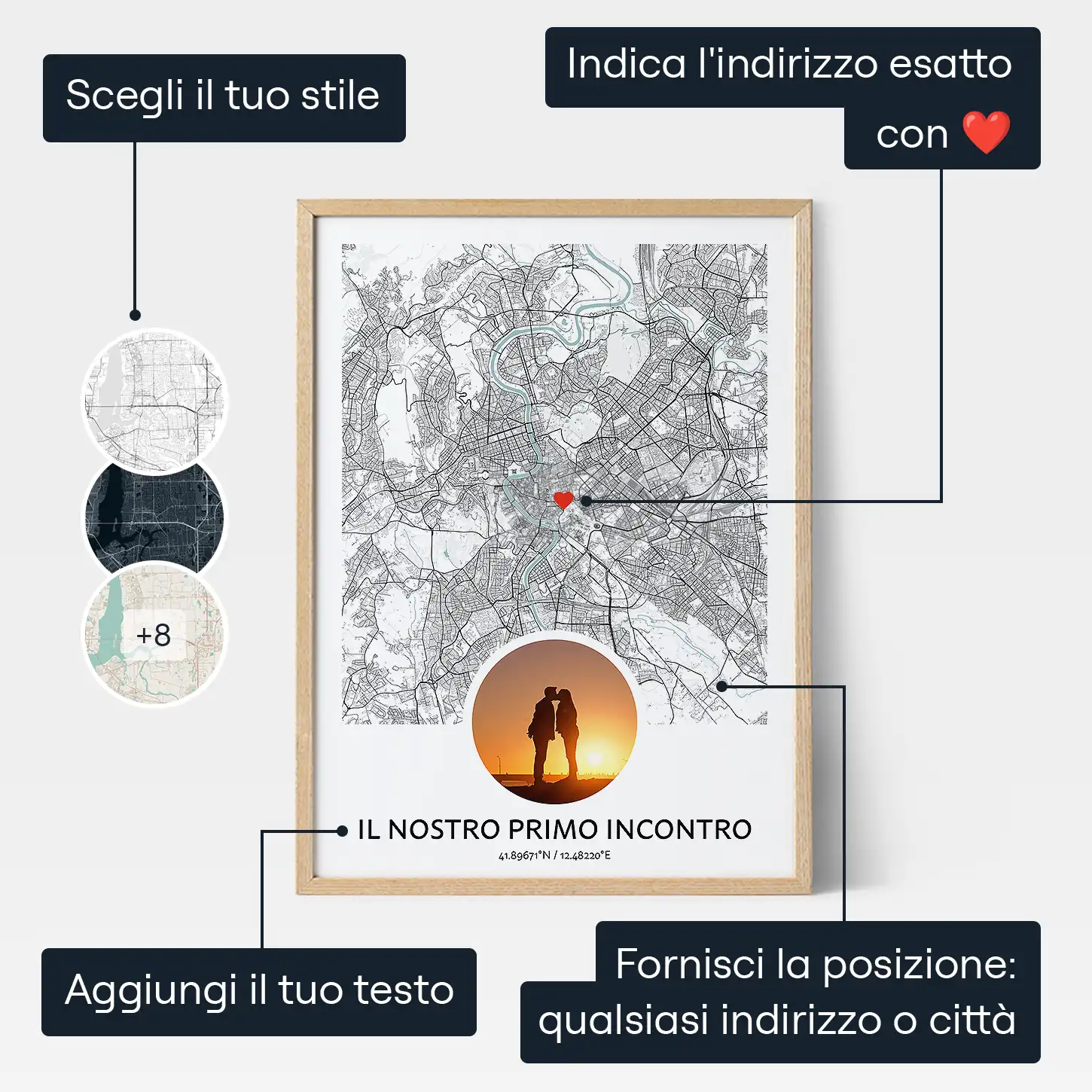Il nostro creatore online rende la personalizzazione semplice. Scegli la forma e i colori della mappa, selezionando tra schemi di colori predefiniti o giocando con i colori tu stesso. Inserisci la posizione, ingrandisci e rimpicciolisci per ottenere la vista perfetta e aggiungi un segnalino a forma di cuore per individuare il punto esatto. Carica la tua foto preferita e aggiungi un messaggio significativo come "Dove ci siamo incontrati".
