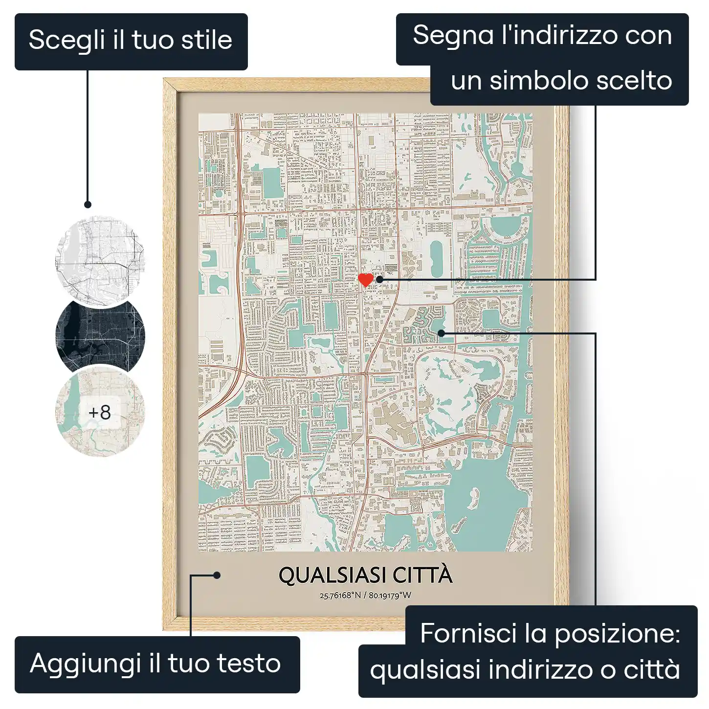 Nulla attira l'attenzione più di una mappa personalizzata appesa alla tua parete! La città dei tuoi sogni potrebbe essere anche in capo al mondo, ma da oggi puoi portarla direttamente a casa tua. Il nostro editor di mappe, infatti, ti offre tutti gli strumenti necessari per personalizzare al massimo la tua mappa. Tra colori, posizione geografica, indicatori di posizione e forma, hai completa libertà. Potresti ancora racchiudere la tua mappa in un romantico cuore! Stampa la mappa personalizzata della tua città preferita su un poster, una tela o un quadro incorniciato. Oppure richiedi un file digitale per il download istantaneo.